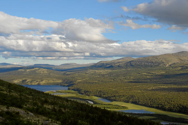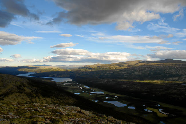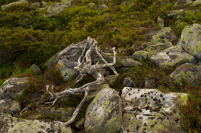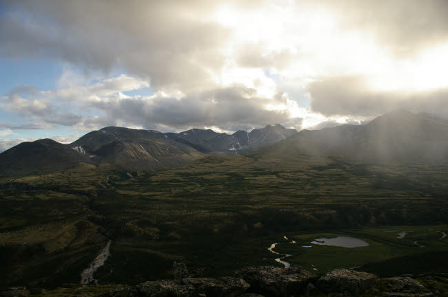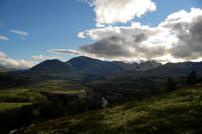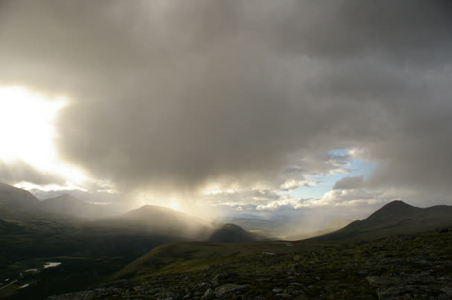 Rondane - Indre Kampen13.07.2006Nach einer langen Autofahrt vom Dalsland hinein nach Norwegen, durchs Tal der Glonna und bis an den Rand des Rondane Gebirges blieb sogar noch etwas Zeit für eine kleine, aussichtsreiche Wanderung auf den Indre Kampen. Den langen Tagen - und kurzen Nächen - sei Dank, dass man abends um 19 Uhr auch noch zu einer 2-3 Stunden Wanderung aufbrechen kann, ohne Angst vor der Dunkelheit zu haben. Ausschlafen geht auch am nächsten Morgen :) Durch lichten Bergwald ging es bei einer gigantischen Lichtstimmung über die Baumgrenze wo Flechten und Mose in allen möglichen Grüntönen den Boden bedecken. Vom Gipfel sichtbar drohte dann am Horizont sogar noch ein Regenschauer und trieb uns rasch wieder ins Tal. Nass wurden wir zum Glück nicht. Zum schlafen fanden wir in der Nähe einen Weg runter zum Fluss und stellten dort unseren Bus auf - Jedermansrecht sei Dank. |