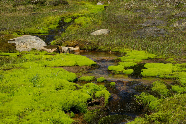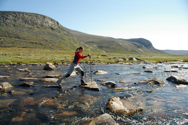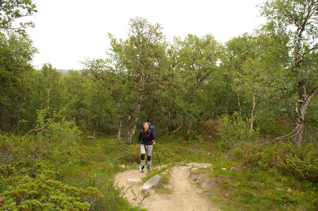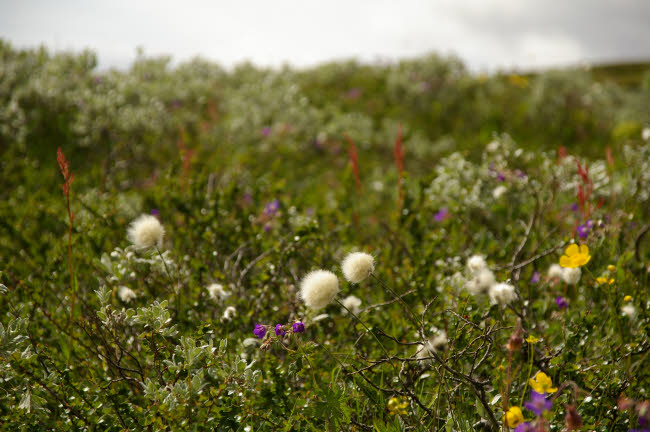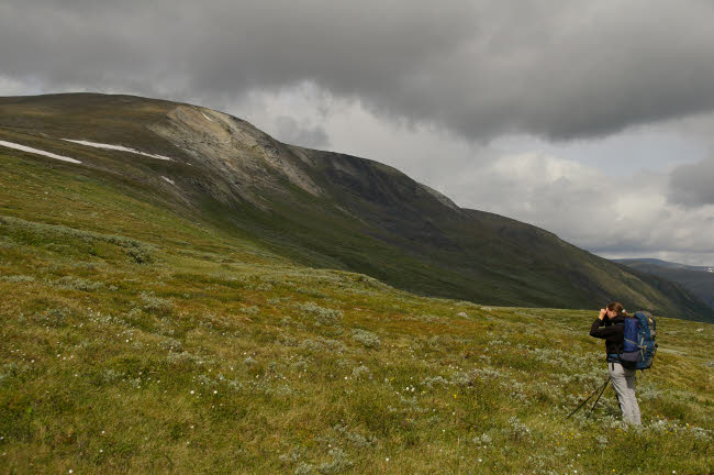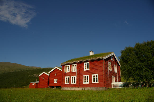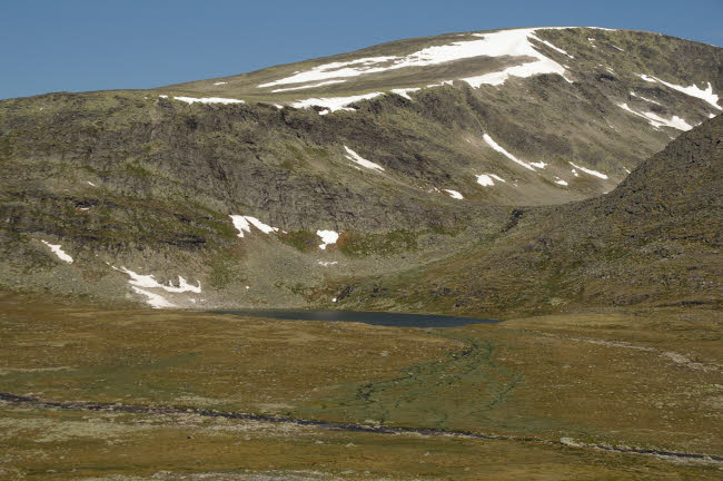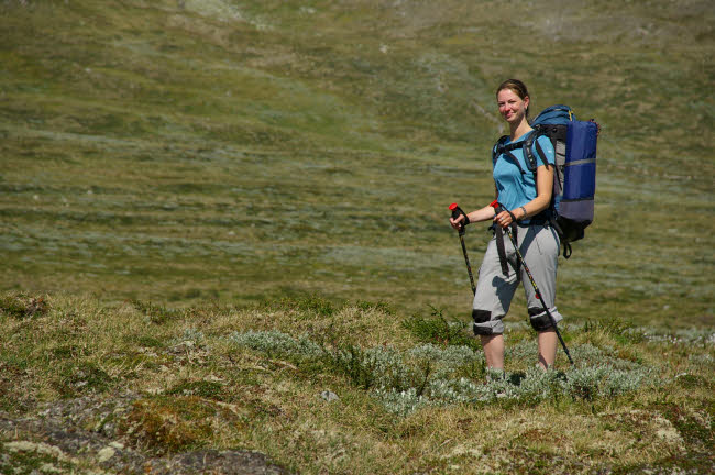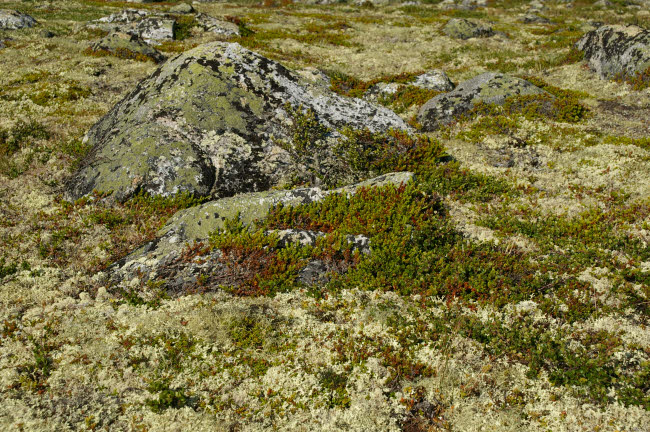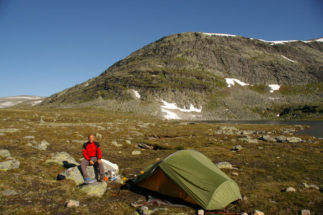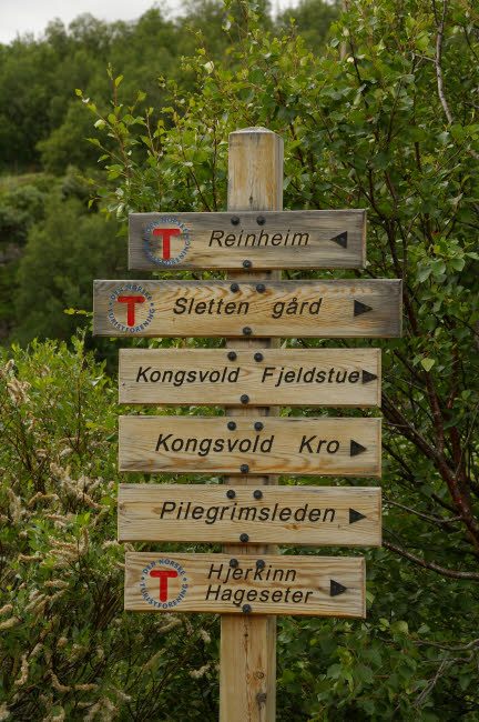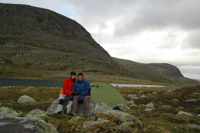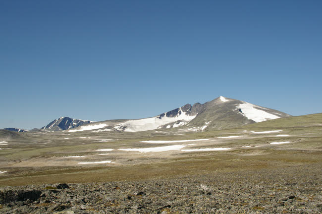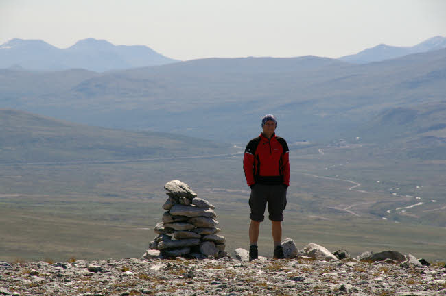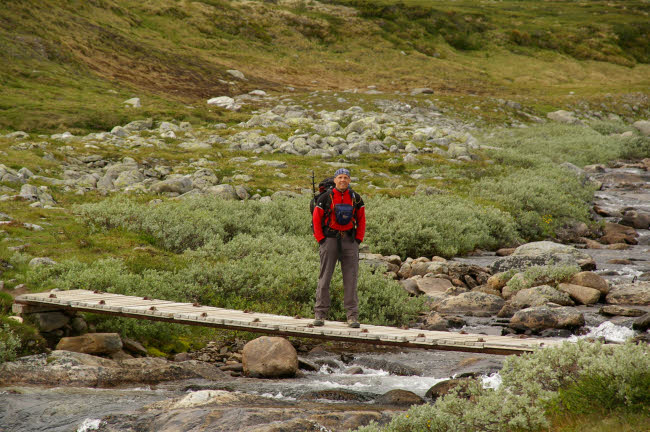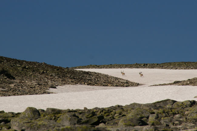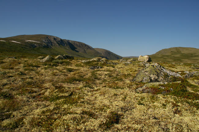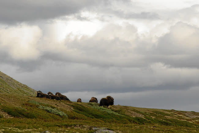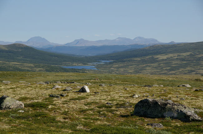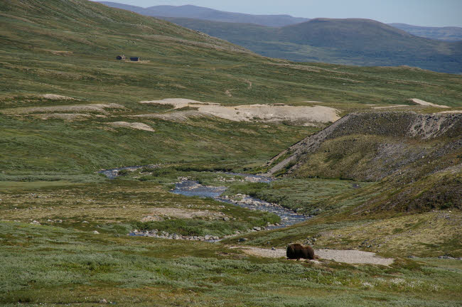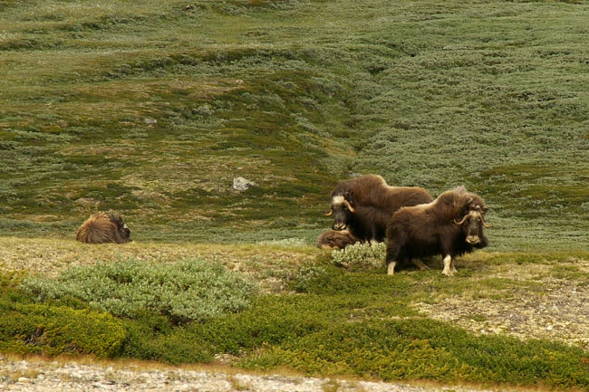 Dovrefjell - Im Land der Moschusochsen14.07.2006 - 15.07.2006Unser nächstes Ziel war der Dovrefjell Nationalpark. Am Rande vorbei führt der Königsweg, auf dem im Mittelalter die norwegischen Könige von Oslo nach Trondheim gereist sind und in Tagesetappenentfernung sog. Fjellstuen als Unterkünfte standen. Eine davon in Hjerkinn, die andere in Kongsfold luden zum Fotostop ein. Kongsvold war auch der Ausgangspunkt unserer Wanderung durchs Dovrefjell ins Land der Moschusochsen. Zwei Tage mit Zelt und Schlafsack bepackt sollten es werden. Ziel: Unbekannt, maximal bis nach Reinheim, eine Hütte am Fuß des Snöhetta (Schneekuppe). Das Wetter heute war kühl und leicht bewölkt, aber mit dem Gepäck auf dem Rücken wurde es schon nicht kalt. Die Moschusochsen - Tiere aus der Urzeit - waren eigentlich in diesem Gebiet schon ausgestorben, aber in den 50er Jahren wieder erfolgreich angesiedelt. Heute leben einige hundert Tiere auf dem Dovrefjell. Immer die Augen offen haltend sind wir also losgewandert. Zuerst eine kleine Steilstufe hinauf und dann relativ flach einen Flusslauf entlang. Mit dem Fernglas waren die ersten Ochsen schnell ausgemacht, aber auf dem Foto waren das nur ein paar Pixel. Also weiter, und irgendwann stand dann eine Herde 50 Meter neben dem Pfad. Beeindruckend, und nach Auskunft der Ranger eigentlich schon zu nahe. Allerdings liesen sich die Tiere nicht groß beeindrucken. Wir sind dann in leichtem Bogen vorbei und haben die Moschusochsen wahrscheinlich genauso erstaunt angeguckt wie sie uns Irgendwann am späten Nachmittag sind wir an einem wunderschön gelegenen See vorbeigekommen und haben beschlossen, dass sich die restlichen 2 km bis zur Hütte bei dem trüben Wetter nicht mehr lohnen und haben unser Zelt aufgebaut. Option von der Hütte wäre am nächsten Morgen eine Besteigung der Schneekuppe gewesen. Den Rest des Abends verbrachten wir mit kuscheln im Schlafsack, Würfeln und Essen kochen - draußen war es nur knapp über null Grad und ungemütlich. Die Überraschung dann am nächsten Morgen - strahlend blauer Himmel und angenehme Temperaturen schon zum Frühstück Für die Schneekuppe war`s zu weit, aber Hügel mit guter Aussicht gibt es noch mehr. Auf dem Weg querfeldein zum Tivlin ist uns dann auch noch eine kleine Herde Rentiere begegnet, und die Aussicht war wirklich genial. Moschusochsen gabs die zwei Tage auch immer wieder, meist einzelne, manchmal kleine Herden von 7-10 Tieren. Die Temperaturen führten schnell dazu Pulli und Mütze wegzupacken, und da wir keine Sonnencreme eingepackt haben gabs rote Nasen bis wir am Abend wieder zurück am Auto waren. |
