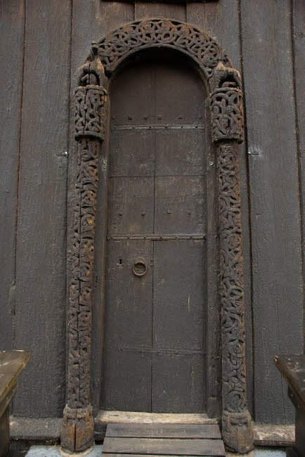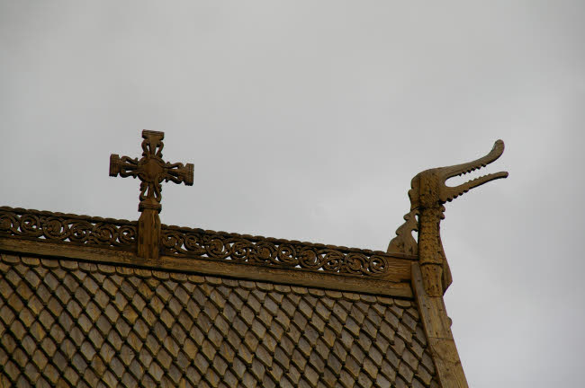 Die Stäbe sind wie Säulen, senkreckte, in den Boden eingelassene Stämme, die die Kirche tragen. Deutlich sichtbar die heidnischen Zeichen aus der Gründungszeit, vermischt mit den christlichen Zeichen aus der Neuzeit. Kreuze neben Drachen.