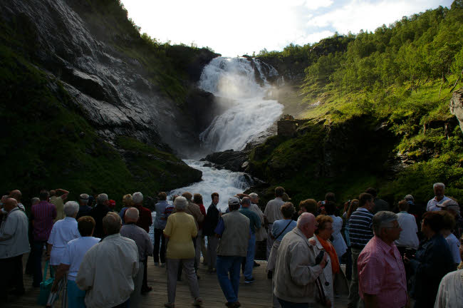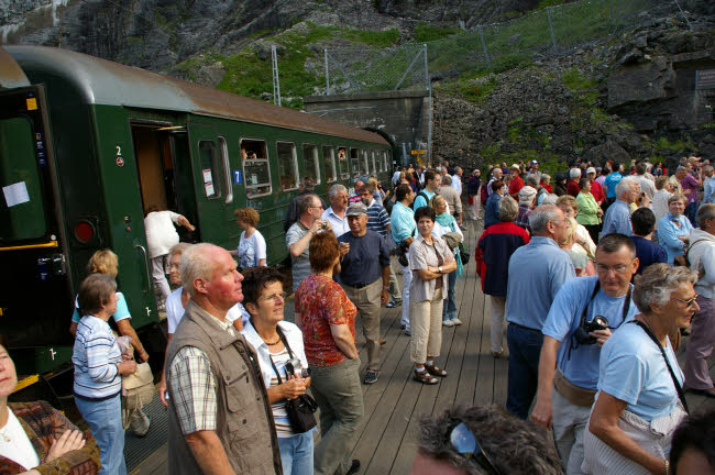 Von Flam würde es erst mal steil bergauf auf die Hochebene des Hardangerjokulen gehen. Wir sparen uns das uns benutzen die steilste Eisenbahn Nordeuropas, die Flambahn, um von Flam nach Hallingskeid zu kommen. Mit einem Zwischenstop am Kjosfossen (Wasserfall), bei dem alle Aussteigen und fleißig Fotos machen und einmal in Myrdal umsteigen ist man so bequem und schnell oben angekommen.