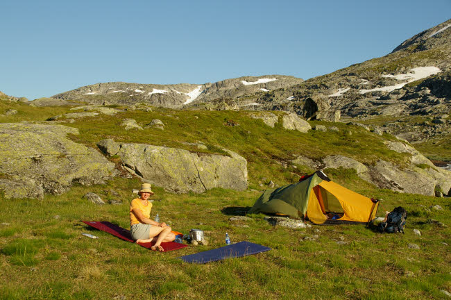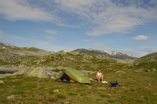 Ein Stück von Hallingskeid entfernt suchen wir uns als erstes einen Platz für unser Zelt an einem Gletscherbach. Damit konnten wir den Rest des Tages mit leichtem Gepäck fahren