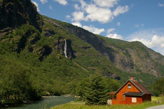 Am nächsten Tag sind wir mit dem ganzen Gepäck den Abschnitt zurück nach Flam gefahren, den wir am Tag zuvor mit der Bahn herauf gekommen sind. Durch tiefe Schluchten, über Brücken, durch Tunneln und Serpentienen, an Wasserfällen vorbei ging es wieder hinab nach Flam.
