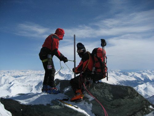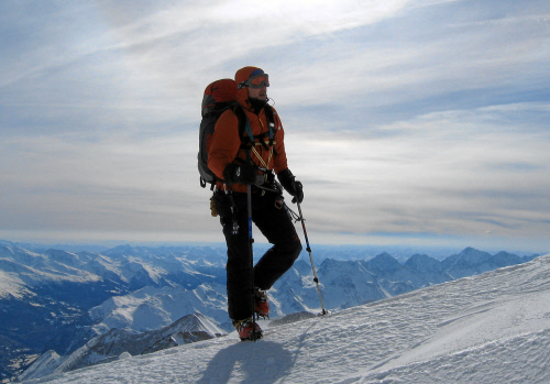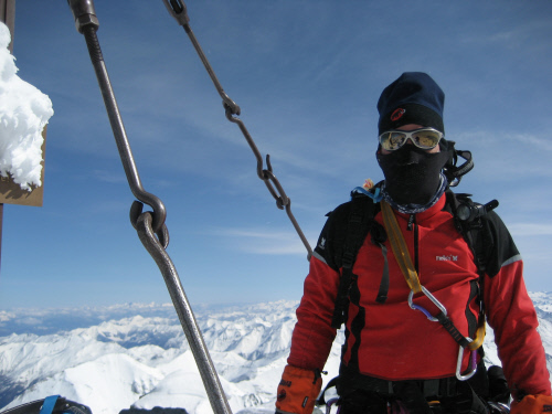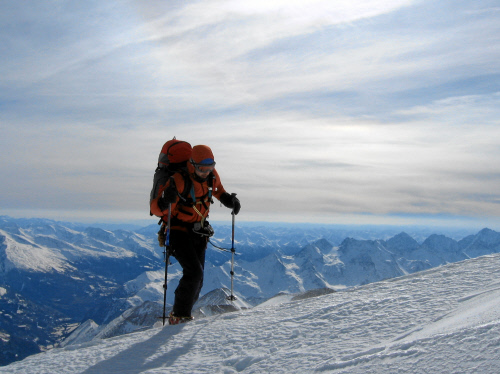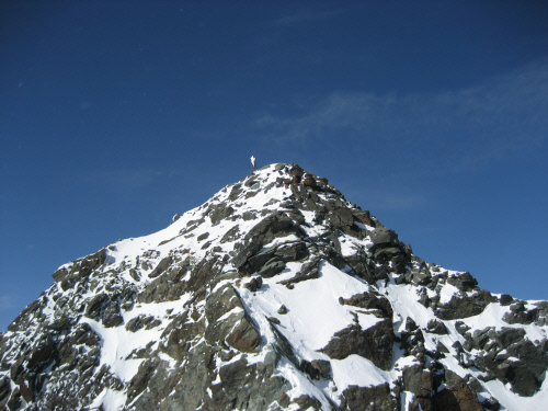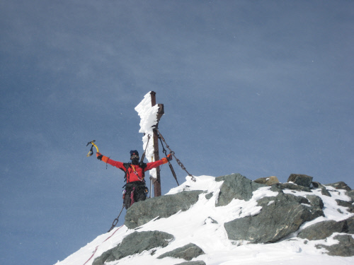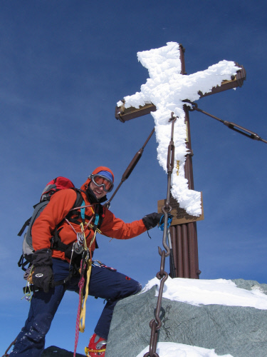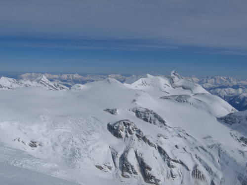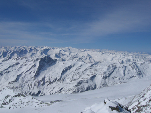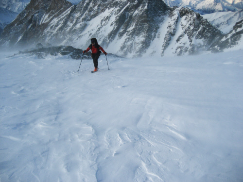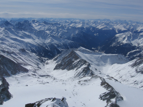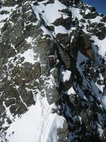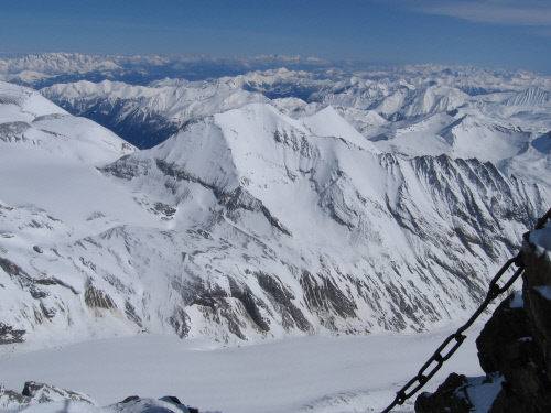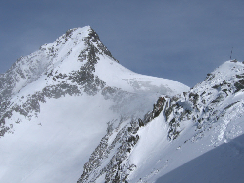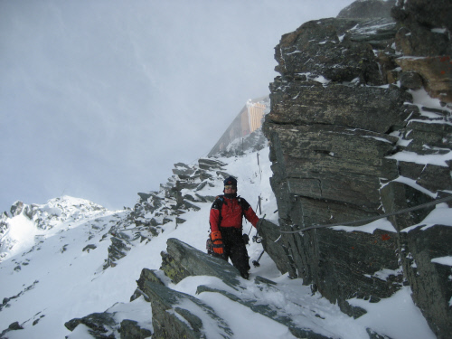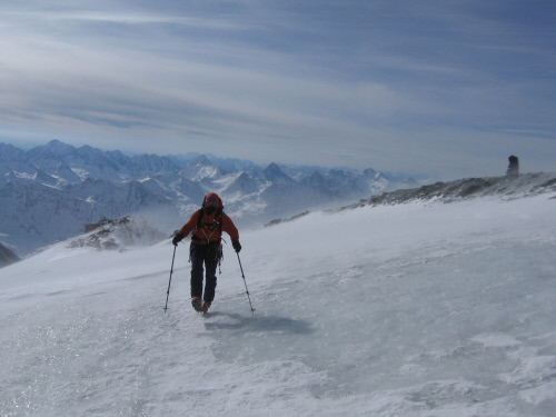Dicht eingepackt gings über das Ködnitzkees und weiter durch den Klettersteig zur Adlersruh. Weiter übers Glocknerleitl und steil in guten Trittfirn mit gelegentlichen Felskontakt zum Kleinglockner. Durch die Zahlreichen Stangen konnte man gut am laufenden Seil gehen und das Seil immer um die Stangen legen. Der Abstieg zur Glocknerscharte war mit einem Stahlseil gut versichert. Danach folgten einige Klettermeter im Fels und wieder leichter werdend zum Gipfel des Großglockners. Größtes Problem an diesem Tag war der stetige Föhnsturm.