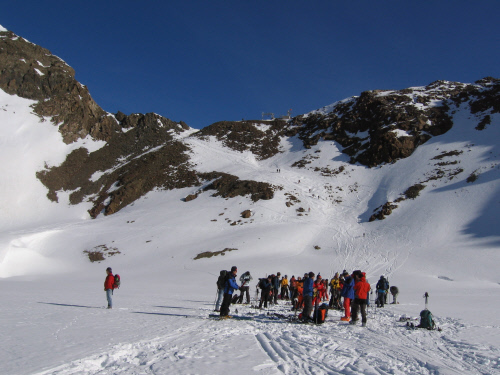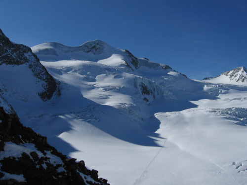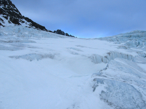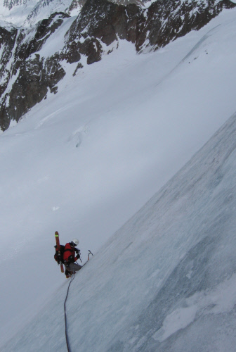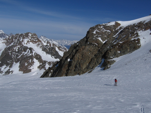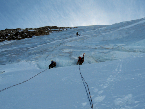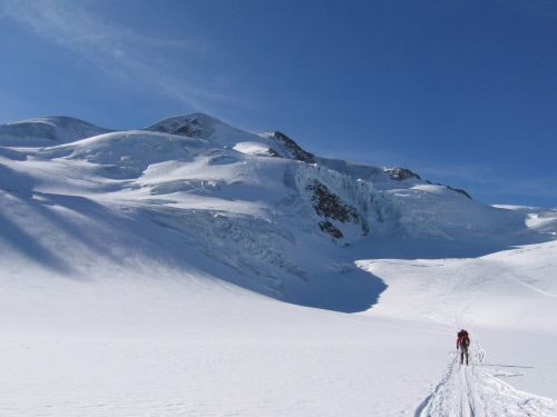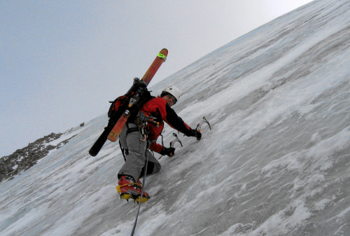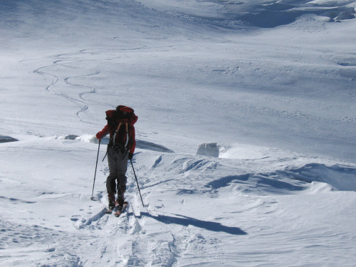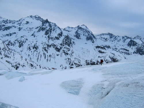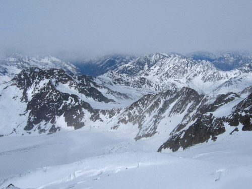 Wildspitze Nordwand17.02.2007mit Andi Wildspitze als Tagestour. Seilbahnhilfe machts möglich. Am Freitag Abend gemütlich ins Pitztal und auf dem Parkplatz der Gletscherbahn noch ein Bierchen getrunken und dann geschlafen. Am Samstag gings dann ausgeschlafen mit der ersten Bahn hinauf zum Mittelbergjoch und mit Ski hinunter auf den Taschachferner. Hier wurde angefellt, und wir kamen jetzt nur noch aus eigener Kraft voran, und zum Glück auch wieder weg von diesem ganzen Skizirkus. Die Nordwand der Wildspitze hatte leider nicht wie telefonisch versprochen eine Firnauflage, sondern war größtenteils blank. Das hieß mal wieder pickeln statt gemütlich stapfen. In der Mitte der Wand machte dann auch das Wetter zu und am Gipfel ging ordentlich Wind. Gipfelrast ade und wieder hinunter. Zum Abschluss dann noch die 2000hm Abfahrt über den Taschachferner zurück zum Auto. Leider waren unsere Beine schon schwer, so dass wir den teilweisen doch recht guten Schnee kaum nutzen konnten. Trotzdem eine super Tour. Ciao Reiner |