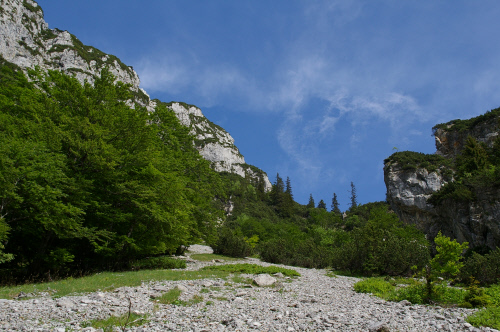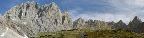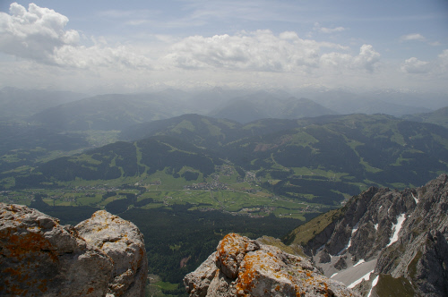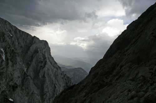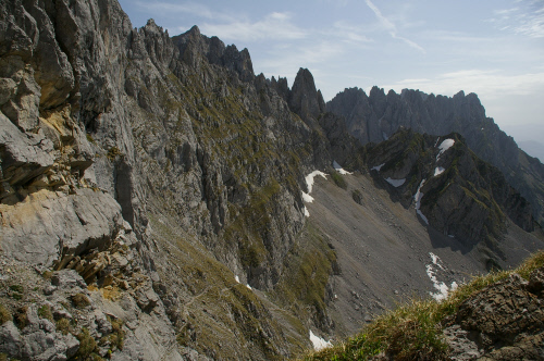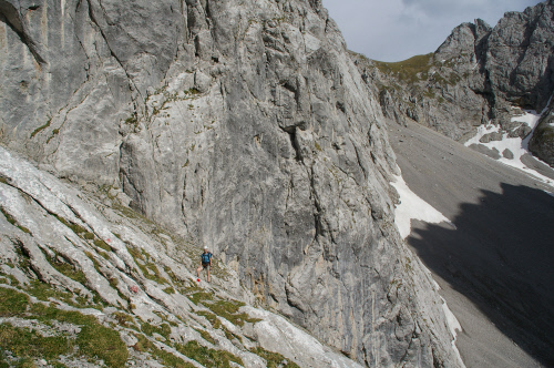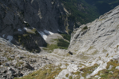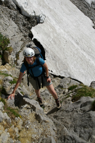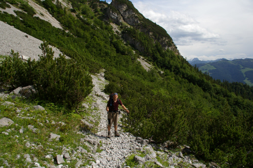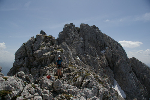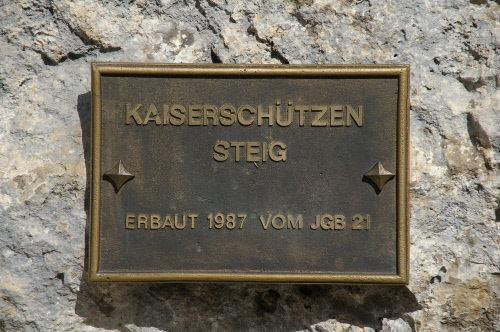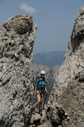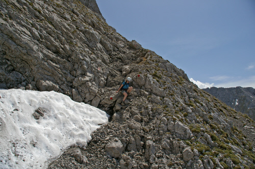 Nach einer gemütlichen Gipfelpause wollen wir über den Kaiserschützensteig hinab ins Kaisertal gehen. Die ersten Meter sind noch Seilversichert, dann kommen aber viele Meter Schrofengelände, bestens markiert, aber sehr ausgesetzt und ungesichert.