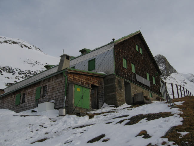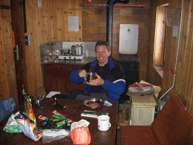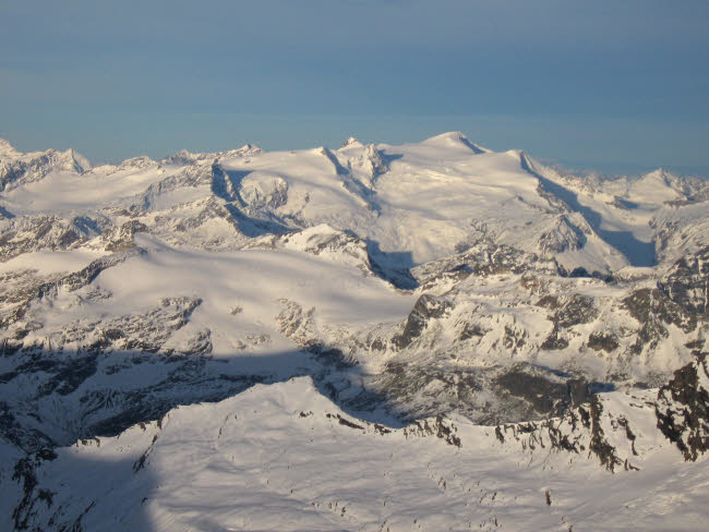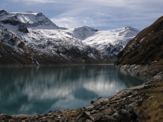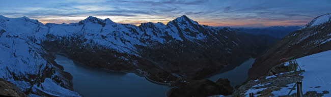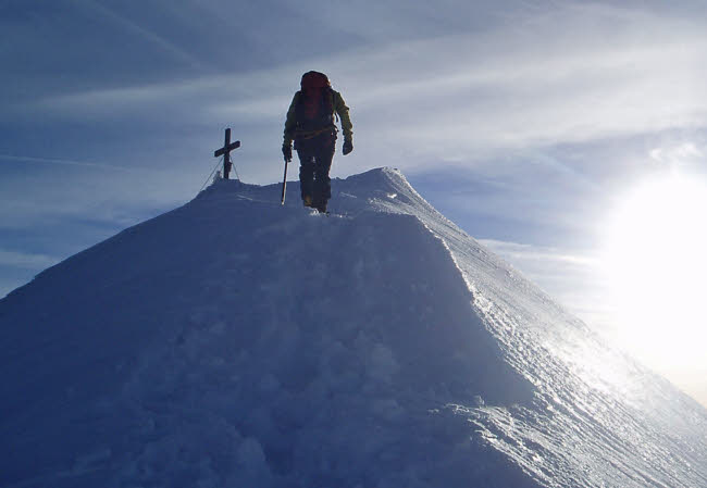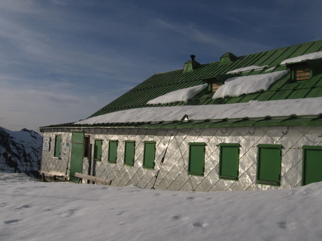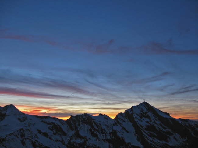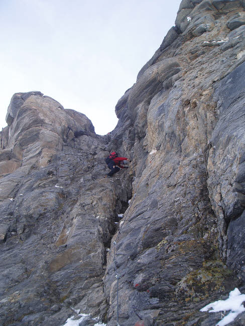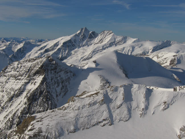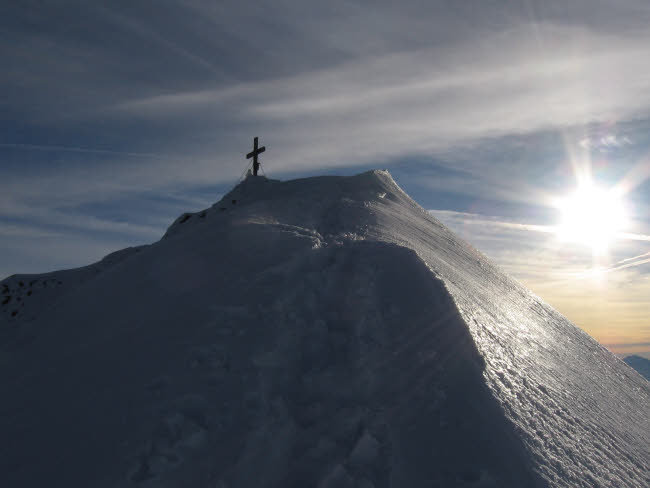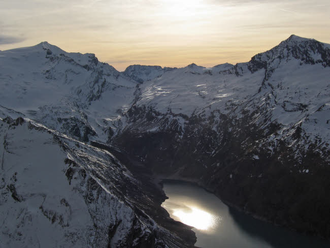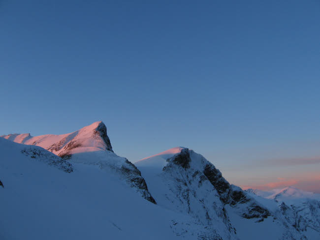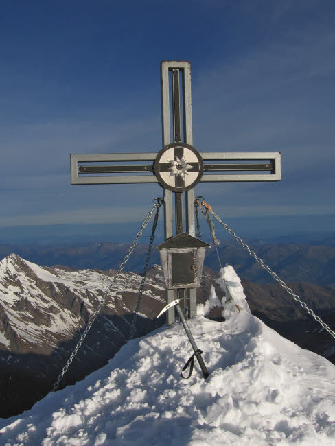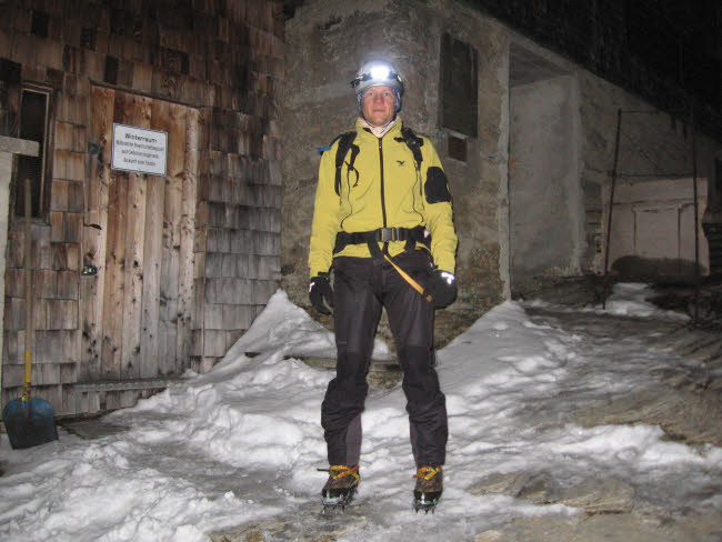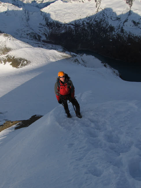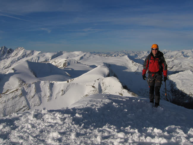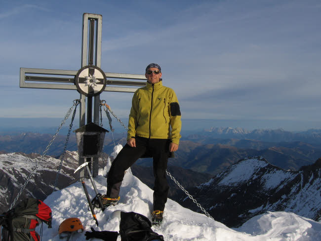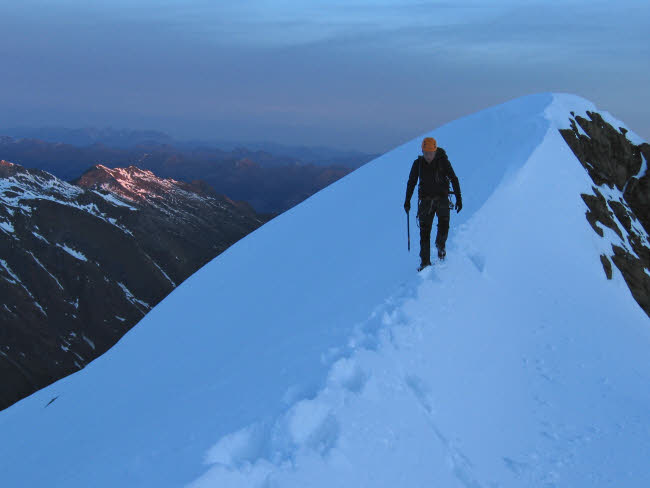 Kaindlgrat - Großes Wiesbachhorn01./02.10.2007mit Brian Hier gehts zum interaktiven Panorama Das Heinrich-Schwaiger-Haus hatte gerade erst ein paar Tage zu gemacht, der Wirt kannte also noch die Bedingungen, und die waren nach seiner Aussage bestens. Über Kitzbühel und Mittersil gings zum Ausgangspunkt, den Parkplatz zum Mooserboden. Von hier fährt man ein Stück mit einem Bus, dann mit einem Schrägaufzug und nochmal mit einem Bus bis zum Mooserboden Stausee. Hier beginnt die eigentliche Tour. Ab jetzt heißt es laufen und steigen. Im steilen Zigzag sind die 800Hm bis zum Heinrich-Schwaiger-Haus aber recht schnell geschafft. Für die letzten Meter wären fast Steigeisen noch gut gewesen, aber so kurz vor der Hütte hats auch nicht mehr gelohnt sie aus dem Rucksack zu kramen. Wir quartierten uns dann im Winterraum ein, der gemütlich, groß und sogar mit Gaskochern ausgestattet war. Sonst kam keiner mehr an diesem Abend, so war auch gewiss, das wir den Gipfel am nächsten Tag für uns alleine haben. Da man im Abstieg den letzten Bus um 15 Uhr am Mooserboden Stausee zurück zum Parkplatz erwischen muss machten wir die Zeitplanung Rückwärts: Etwas Sicherheit, Abstieg von der Hütte, Zusammenpacken, Abstieg vom Gipfel, Aufstieg zum Gipfel und kamen auf eine Startzeit um kurz nach 6 Uhr. Die ersten Meter also noch mit Stirnlampen zur Einstiegsrinne, die mit einem ordentlichen Stahlseil versichert ist und von der Kletterei im Führer nichts übrig gelassen hat. Weiter im ersten Tageslich hinauf auf den Grat und problemlos Richtung Gipfel. Um Halbneun, weit vor unserem Zeitplan waren wir bei traumhafter Sicht und Stimmung am Gipfel. Nach fast einer Stunde Pause und Aussicht genießen sind wir dann wieder hinabgestiegen und waren sogar fast noch rechtzeitig zum Weißwurstfrühstück unten am Mooserboden. Besser so verkalkuliert als anders rum. Starten mit Stirnlampe und dann den Sonnenaufgang schon hoch oben erleben ist immer wieder schön und ergreifend. Genialer Berg, geniale Tour und Brians bisher höchster Berg. Congratulations Ciao Reiner |