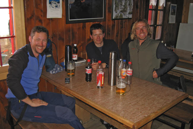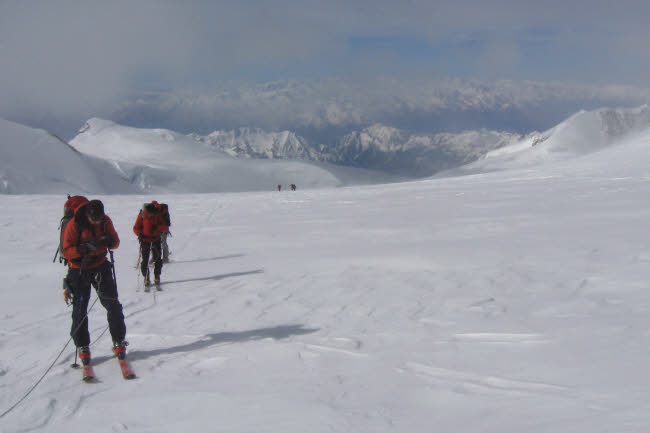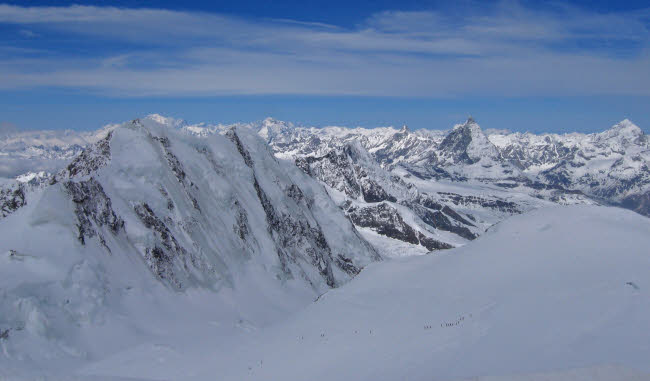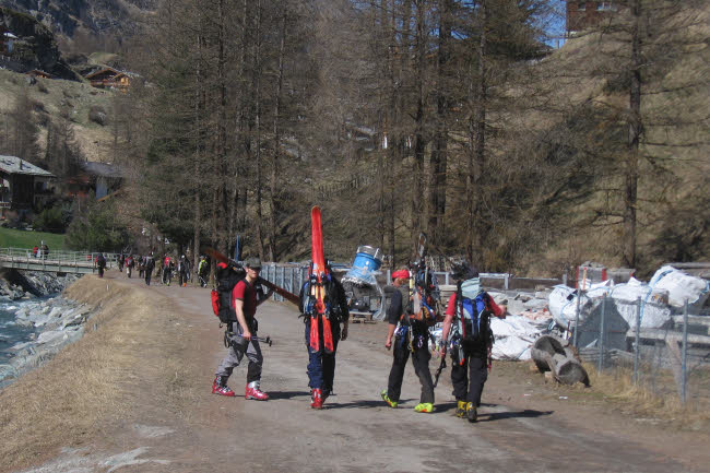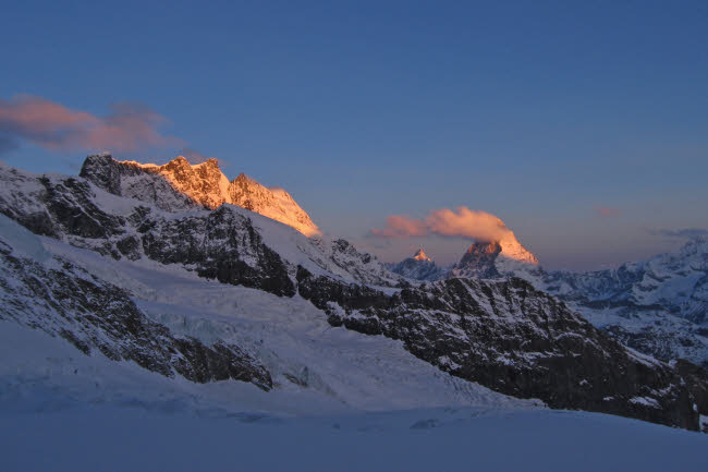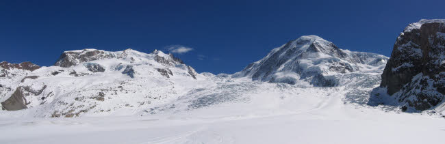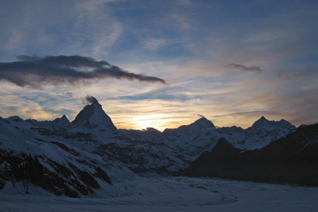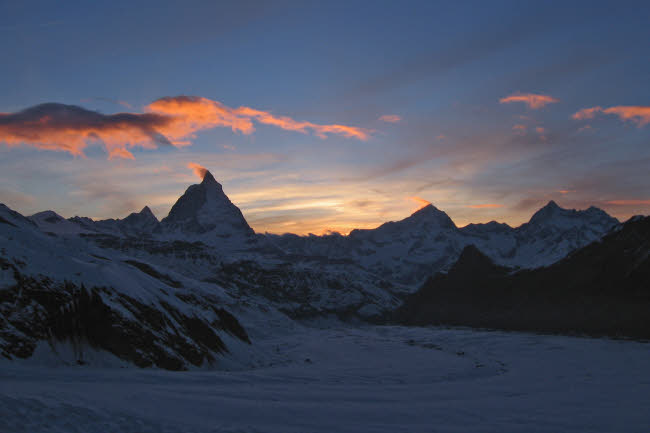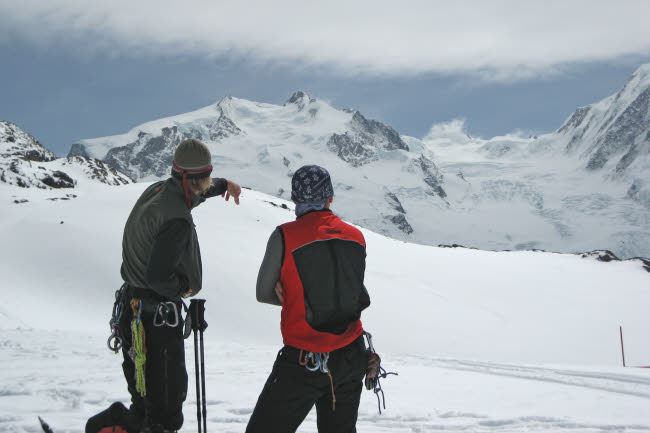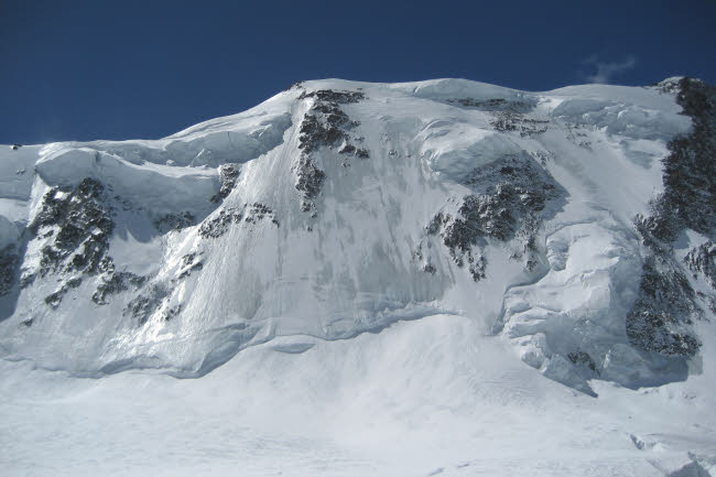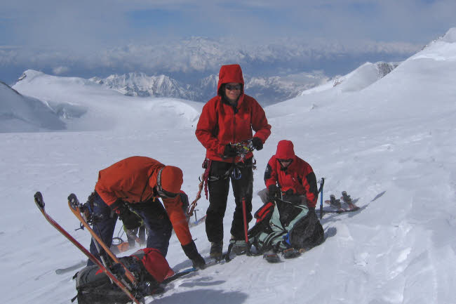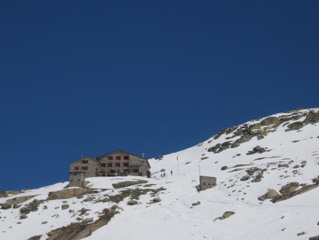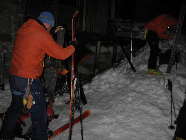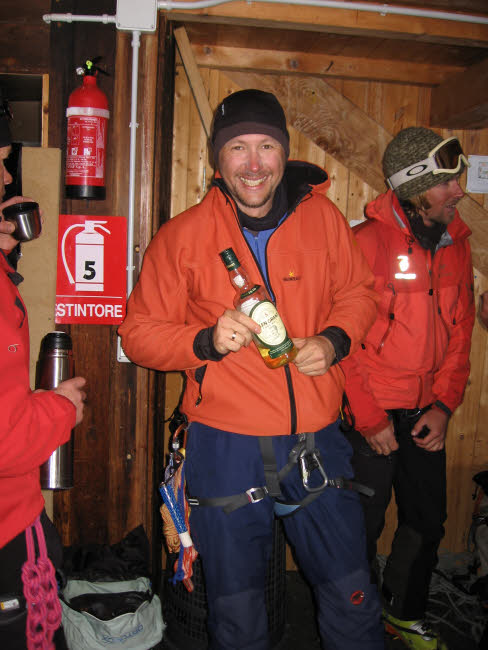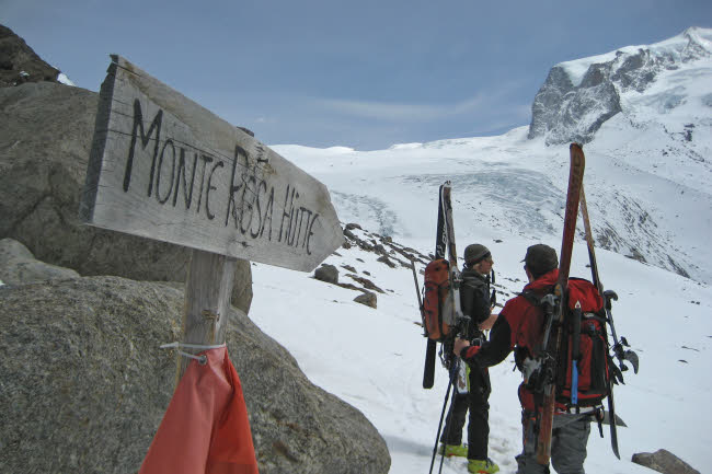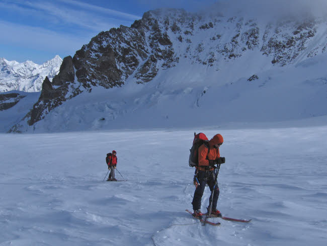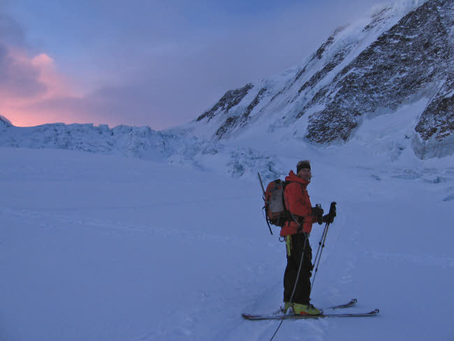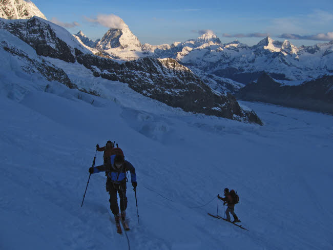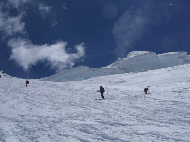 Monte Rosa Hütte25.04. - 26.04.2008Nach ausschlafen und lecker Frühstücken beginnt der nächste Tag mit einem Marsch durch Zermatt - vom Umschlagplatz gings zur Gornergratbahn. Im Zermatt ist dies aber ein gewohnter Anblick, mit dickem Rucksack und Pickel zwischen den ganzen Skigästen. Auch den Weg zur Monte Rosa Hütte verkürzten wir. Mit der Gornergratbahn gings hinauf zur Station Rotenboden. Von dort eine lange Querung die Seitenmoräne hinab auf den Grenzgletscher und weiter aufwärts durch den Gletscherbruch zur Hütte. Lager beziehen, Chillen, Nickerchen, Aussicht geniesen, Abendessen, Sonnenuntergang bestaunen und fotografieren und dann zeitig ins Bett. Die Organisation der Hütte, das Essen und alles passte super, vielleicht lags an dem Fotoreporter der Zeitschift GEO, der eine Reportage über Skitouren im Wallis macht. Ansonst Danke ans Hüttenteam. Um kurz vor 5 Uhr gings los. Mit der Stirnlampe gings auf vor Kälte knirschenden Schnee in die Dunkelheit bis sich langsam das erste Licht des Tages zeigte. Nach einer Stunde betritt man den Gletscher und in einigen Bögen führt der Weg hinauf Richtung Lisjoch. Ein eiskalter Wind hat uns den Gletscher hochgetrieben, ungemütliche Pausen, aber immer wieder phantastische Lichtstimmung. Wir kamen zügig voran, die Anstrengung war uns allerdings allen anzusehen. Nach 5 1/2 Stunden waren wir am Skidepot der Zumsteinspitze und der Wind legte hier nochmal zu. Da ich vor ein paar Jahren schon auf der Zumsteinspitze war machte ich mich auf den Weg zur Signalkuppe wo die Capana Margeritha stehte. Dom und Bert haben sich noch zum Gipfel der Zumsteinspitze hochgekämpft, Andi drehte nach ein paar Metern am windigen Grat um und folgte mir. Auf dem Weg zur Signalkuppe hatte ich dann zwei Italiener vor mir, die sich tapfer den steilen Gipfelhang mit Harscheisen hochkämpften. Sie bemerkten zwar bereits nach einigen Metern, dass das keine gute Idee auf dem eisig, harten Hang war, aber sich machten eifrig weiter. Kämpfen, kämpfen, kämpfen. Einer der beiden hatte dann noch Glück im Unglück und blieb unverletzte, als ihm einige Meter vor dem Ende doch noch der Ski wegrutscht und er die ca. 80Hm zum Wandfuß über den Schnee hinab schlittert. Ich wäre gar nicht auf die Idee gekommen hier ohne Steigeisen zu gehen. Die Abfahrt war dann eine der abwechslungsreichsten, die ich je gemacht habe. Bei knapp 4600m gings los im Pulver im Wechsel mit Harsch, über Butterfirn zur Hütte, weiter über Firn und Sulz zum Gletschertor, dort durch eine spektakuläre Schlucht, z.T. am schon fließenden Wasser entlang hinab auf dem letzten Schneeband direkt hinein nach Zermatt. 3000 Hm Super Tourenwoche. Geile Berge, geile Abfahrten. Ciao Reiner |