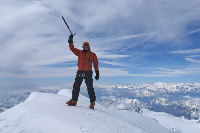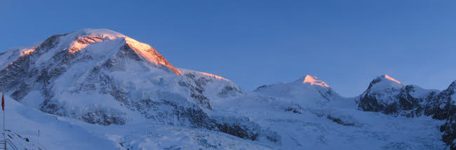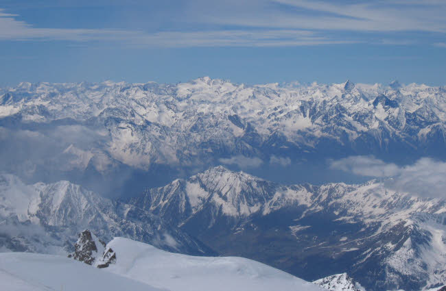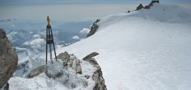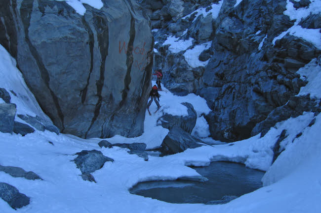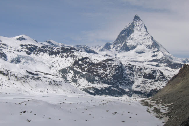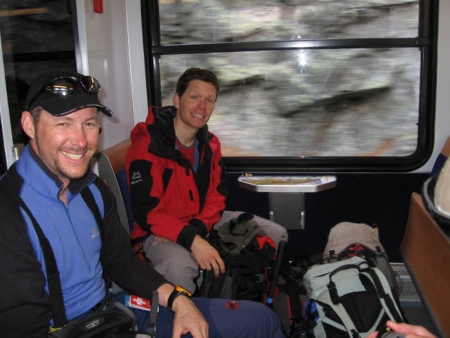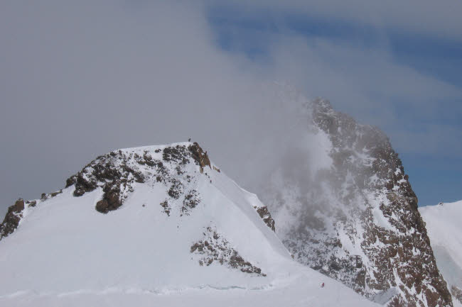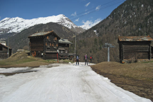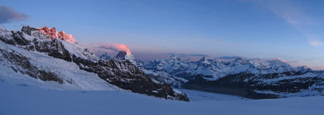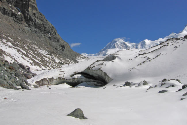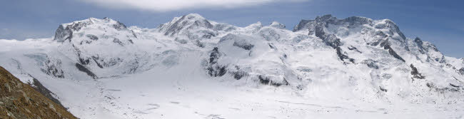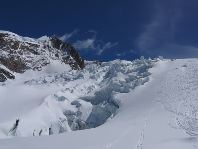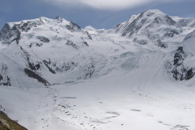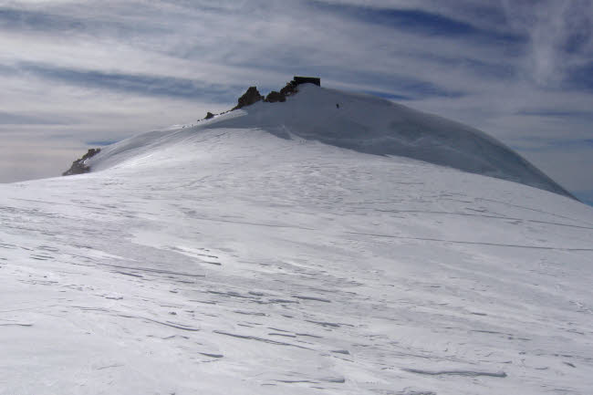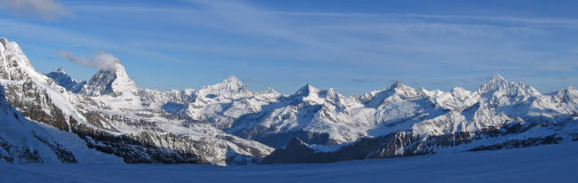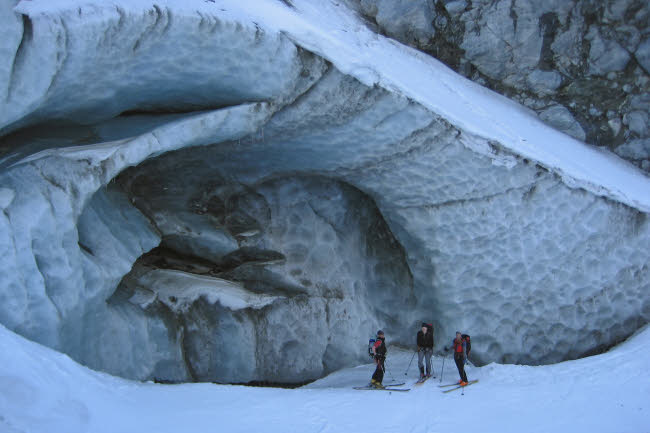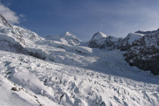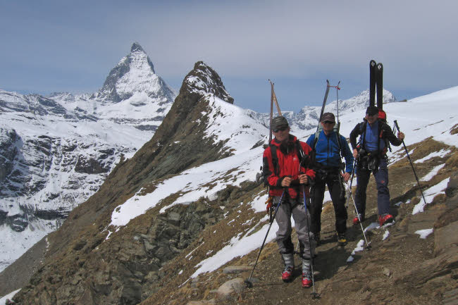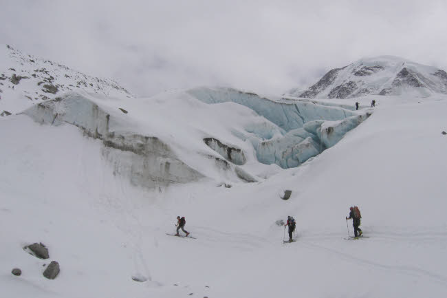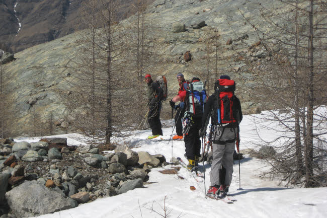 Monte Rosa Hütte25.04. - 26.04.2008Nach ausschlafen und lecker Frühstücken beginnt der nächste Tag mit einem Marsch durch Zermatt - vom Umschlagplatz gings zur Gornergratbahn. Im Zermatt ist dies aber ein gewohnter Anblick, mit dickem Rucksack und Pickel zwischen den ganzen Skigästen. Auch den Weg zur Monte Rosa Hütte verkürzten wir. Mit der Gornergratbahn gings hinauf zur Station Rotenboden. Von dort eine lange Querung die Seitenmoräne hinab auf den Grenzgletscher und weiter aufwärts durch den Gletscherbruch zur Hütte. Lager beziehen, Chillen, Nickerchen, Aussicht geniesen, Abendessen, Sonnenuntergang bestaunen und fotografieren und dann zeitig ins Bett. Die Organisation der Hütte, das Essen und alles passte super, vielleicht lags an dem Fotoreporter der Zeitschift GEO, der eine Reportage über Skitouren im Wallis macht. Ansonst Danke ans Hüttenteam. Um kurz vor 5 Uhr gings los. Mit der Stirnlampe gings auf vor Kälte knirschenden Schnee in die Dunkelheit bis sich langsam das erste Licht des Tages zeigte. Nach einer Stunde betritt man den Gletscher und in einigen Bögen führt der Weg hinauf Richtung Lisjoch. Ein eiskalter Wind hat uns den Gletscher hochgetrieben, ungemütliche Pausen, aber immer wieder phantastische Lichtstimmung. Wir kamen zügig voran, die Anstrengung war uns allerdings allen anzusehen. Nach 5 1/2 Stunden waren wir am Skidepot der Zumsteinspitze und der Wind legte hier nochmal zu. Da ich vor ein paar Jahren schon auf der Zumsteinspitze war machte ich mich auf den Weg zur Signalkuppe wo die Capana Margeritha stehte. Dom und Bert haben sich noch zum Gipfel der Zumsteinspitze hochgekämpft, Andi drehte nach ein paar Metern am windigen Grat um und folgte mir. Auf dem Weg zur Signalkuppe hatte ich dann zwei Italiener vor mir, die sich tapfer den steilen Gipfelhang mit Harscheisen hochkämpften. Sie bemerkten zwar bereits nach einigen Metern, dass das keine gute Idee auf dem eisig, harten Hang war, aber sich machten eifrig weiter. Kämpfen, kämpfen, kämpfen. Einer der beiden hatte dann noch Glück im Unglück und blieb unverletzte, als ihm einige Meter vor dem Ende doch noch der Ski wegrutscht und er die ca. 80Hm zum Wandfuß über den Schnee hinab schlittert. Ich wäre gar nicht auf die Idee gekommen hier ohne Steigeisen zu gehen. Die Abfahrt war dann eine der abwechslungsreichsten, die ich je gemacht habe. Bei knapp 4600m gings los im Pulver im Wechsel mit Harsch, über Butterfirn zur Hütte, weiter über Firn und Sulz zum Gletschertor, dort durch eine spektakuläre Schlucht, z.T. am schon fließenden Wasser entlang hinab auf dem letzten Schneeband direkt hinein nach Zermatt. 3000 Hm Super Tourenwoche. Geile Berge, geile Abfahrten. Ciao Reiner |