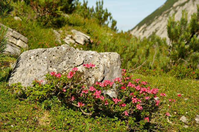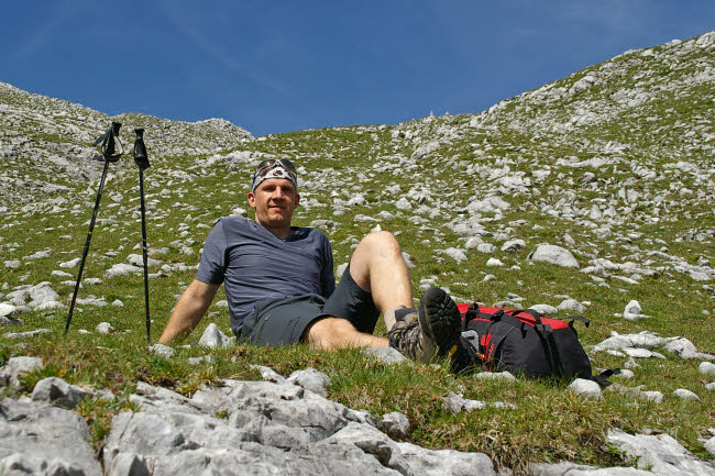 Hier gibts das letzte fließende Wasser, also nochmal 3kg mehr in den Rucksack, das Fahrad hinter eine Latsche und weiter gehts zu Fuß. Der Weg hinauf ist meist nur zu erahnen, hin und wieder gibt es Trittspuren und ein paar Steinmanderl. In den Latschen ist man auch ganz schnell in einer Sackgasse gelandet, wenn man die versteckten Abzweige nicht sieht. Ein paar mal musste auch ich ein paar Meter zurück gehen, bin aber im großen und ganzen gut durch die Latschen gekommen. Auch die Hitze war erträglich, obwohl es ein Südhang und inzwischen schon gut nach 14 Uhr war.