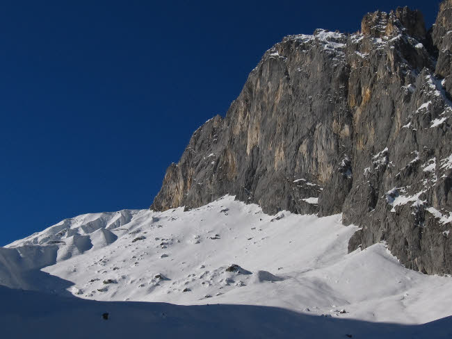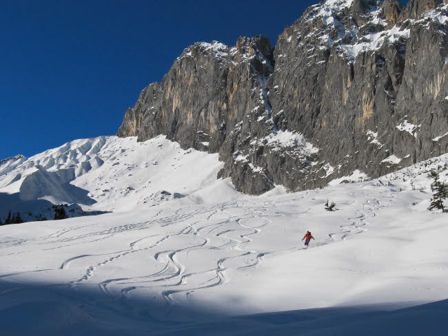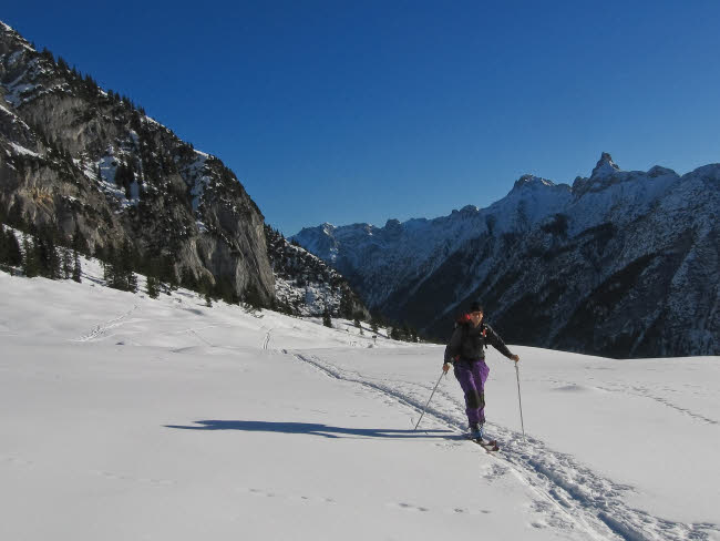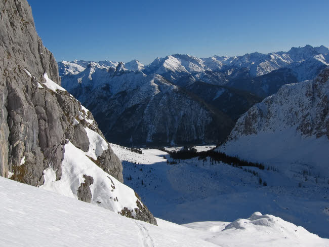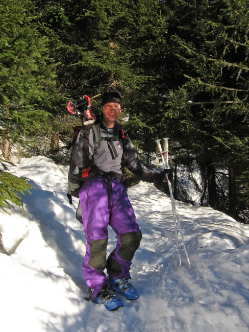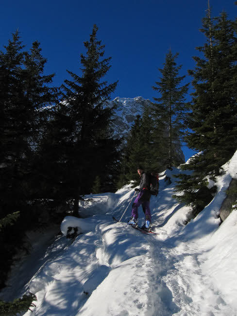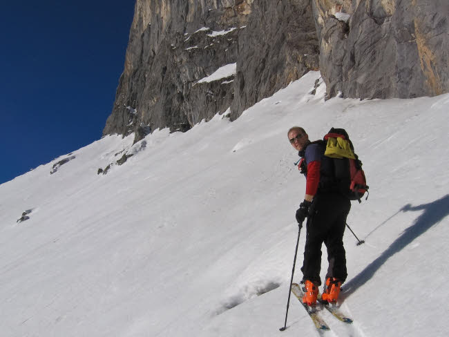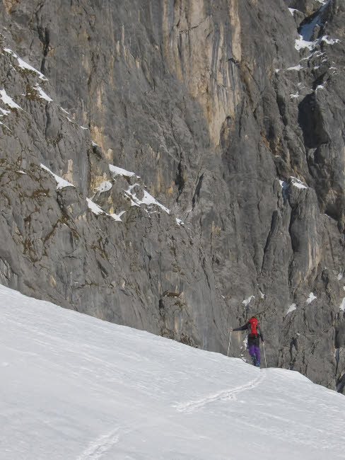 Nach den ersten 400 Hm im Wald auf dem Sommerweg, teils die Ski tragend öffneten sich die Hänge auch und es ging was. Im Hang direkt unter der Schlüsselkar Südwand gabs schon schönen Firn und weiter unten dann noch ordentlich Pulver. Der Harsch dazwischen ist schon wieder vergessen.