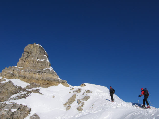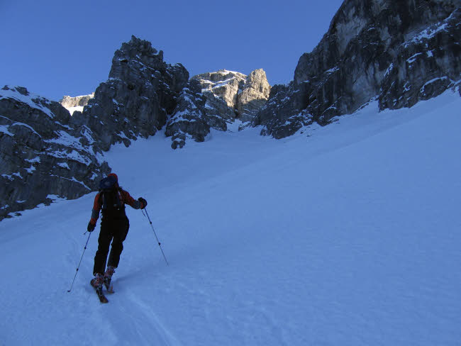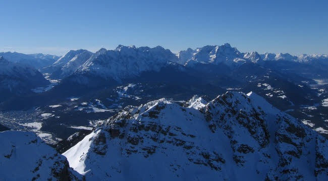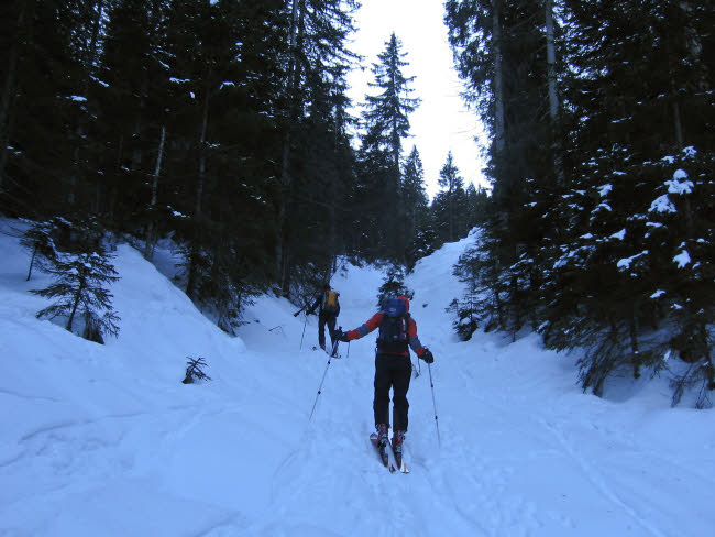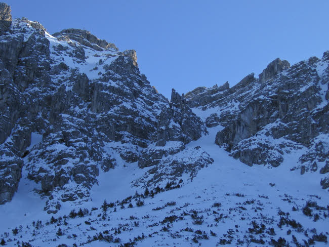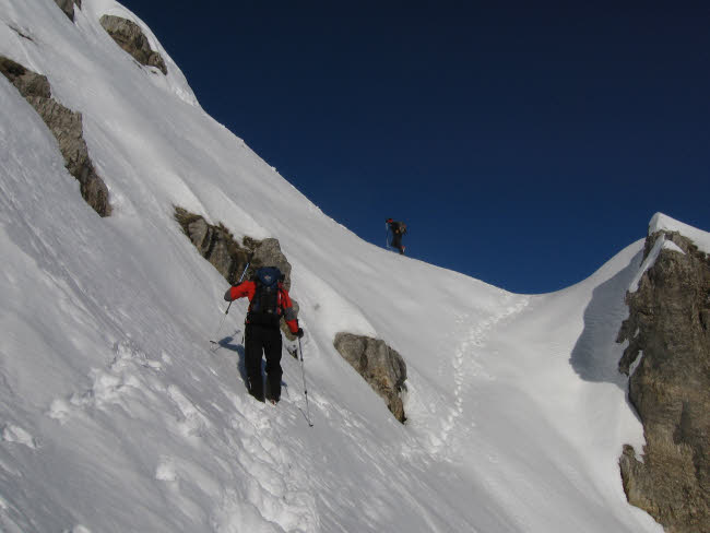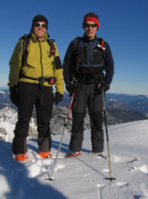 Schöttlkarspitze10.01.2009mit Hannes und Max Max als Local hat gewusst, dass der nordseitige Anstieg zur Schöttlkarspitze geht. Also müssen wir gar nicht weit fahren. In Krün gehts los, auf dem Forstweg Richtung Fischbachalm. Irgendwann gehts rechts weg in einen Hohlweg oder Bachbett weiter hinauf über die Baumgrenze. Von hier zieht eine geniale Rinne zum Grat hinauf, wo erst mal Skidepot und Sonne angesagt war. Ein paar Meter noch zu Fuß und wir waren am Gipfel. Lawinenwarnstufe 1 machts möglich. Für Max war ich zwar etwas zu langsam, aber nach 3 Wochen krank und die erste richtige Skitour im Jahr fand ich es ok - 1250Hm - fertig und glücklich Ciao Reiner |