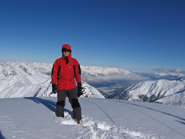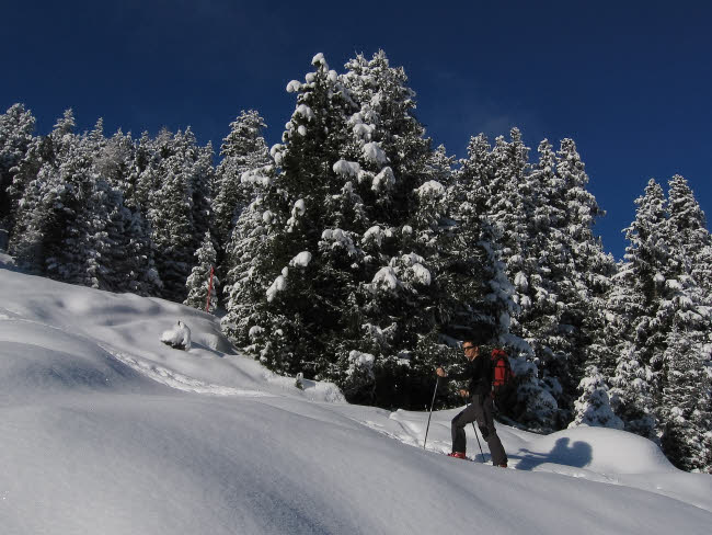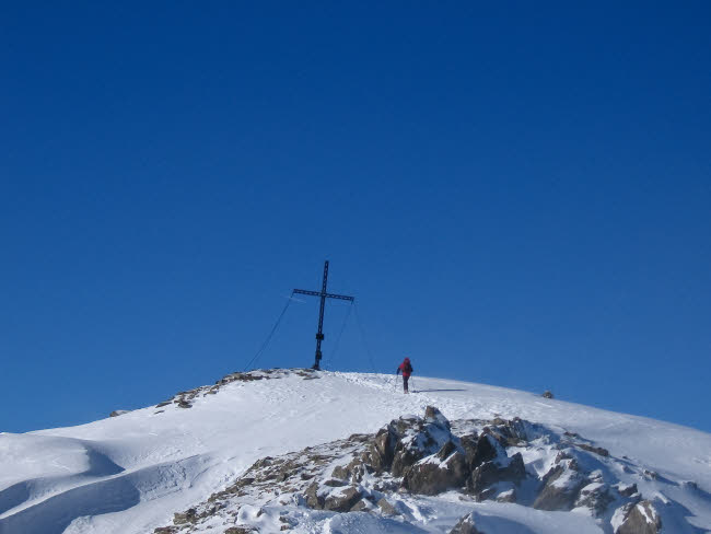 Am Freitag war dann leider der Himmel bedeckt und zum Mittag hin kamen auch die ersten Flocken. Und da wir zuerst am falschen Parkplatz losgegangen sind und somit unseren Weg nicht finden konnten, haben wir den Schneefall und Sturm am Gipfel des Wetterkreuzes voll mitgenommen.