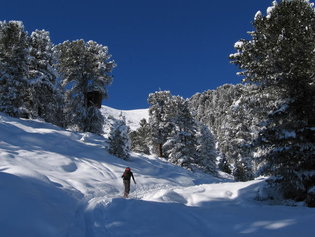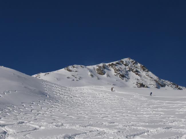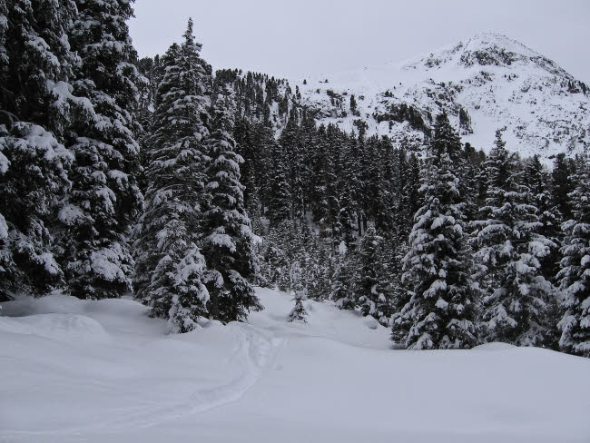 Nach einigen Neuschneefällen war der Donnerstag der erste schöne Tag. Bekanntlich ist dieser Tag recht lawinengefährdet, so dass wir uns das beliebte Tourenziel über Praxmar, die Lampsenspitze, ausgesucht haben. Vorher muss die einer Piste geglichen haben.