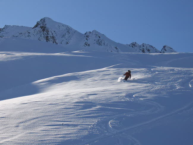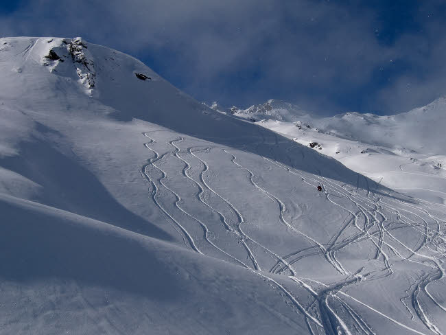 Heute gibts für uns aber 30cm Pulver oben drauf. Die ersten sind wir zwar nicht mehr, aber genug Platz für einen neue Linie ist da. Teilweise staubts bis über den Kopf.