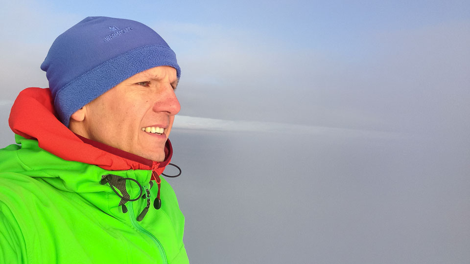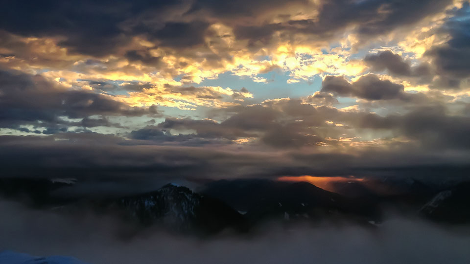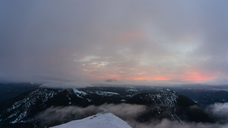 Trotz guter Wettermeldung hat es auf der Anfahrt und dem Aufstieg geregnet und dann weiter oben geschneit. Ich hatte schon die Hoffnung auf einen farbigen Sonnenaufgang aufgegeben, als im Osten sich das erste Rosa zeigte -und es wurde von Minute zu Minute besser.