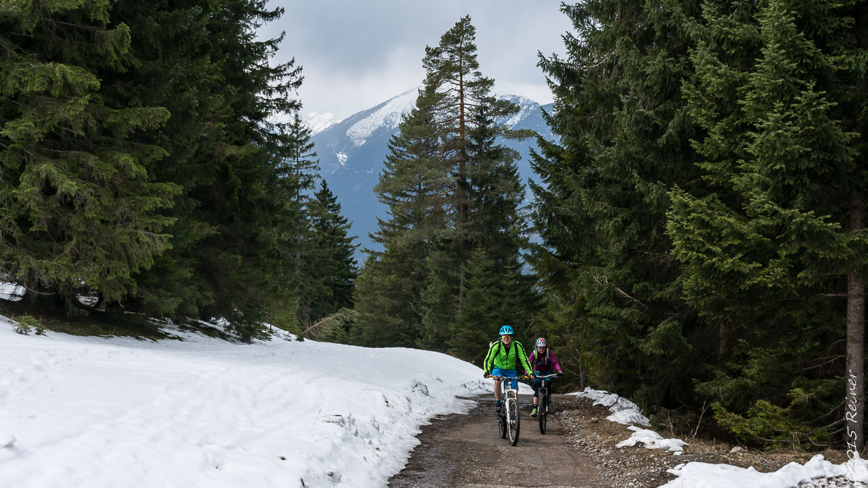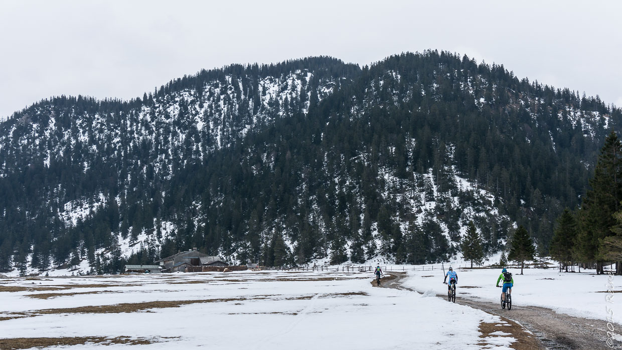 Treffpunkt in Farchant, und dann gings über die Forststraße zum Teil mächtig steil doch immer gemütlich hinauf zur Esterbergalm. Ab dem Sattel zur Alm lag dann auch schon Schnee und Regen von oben gabs dazu.