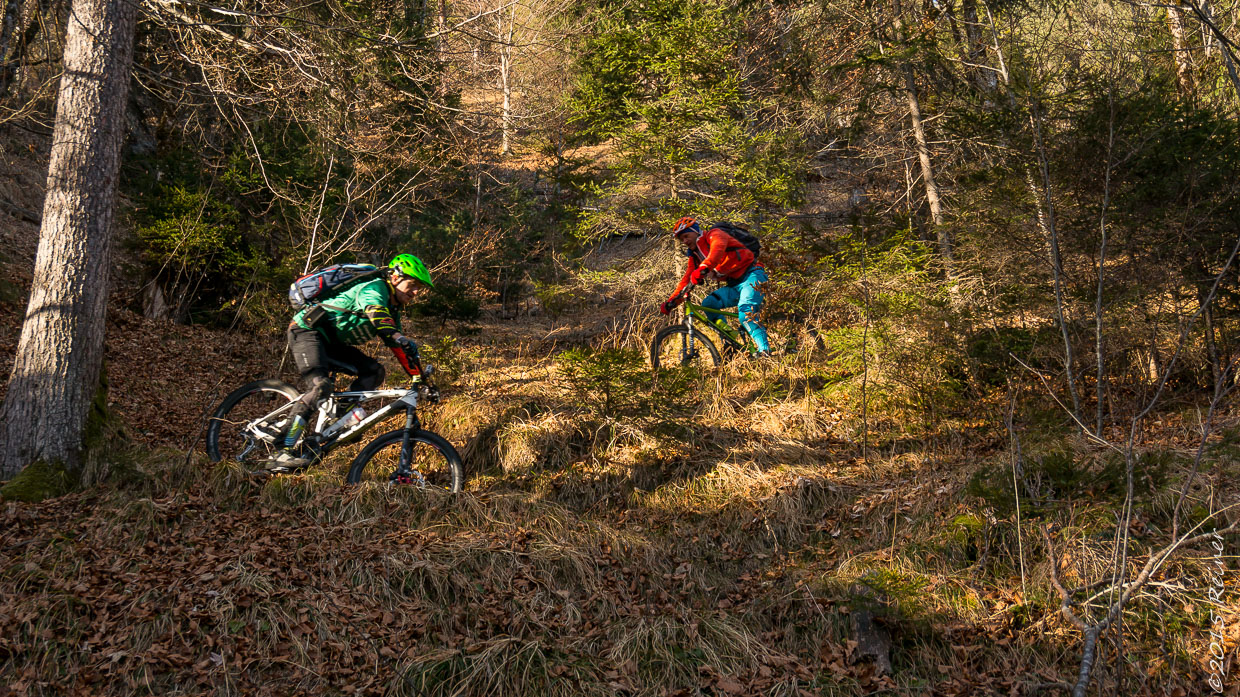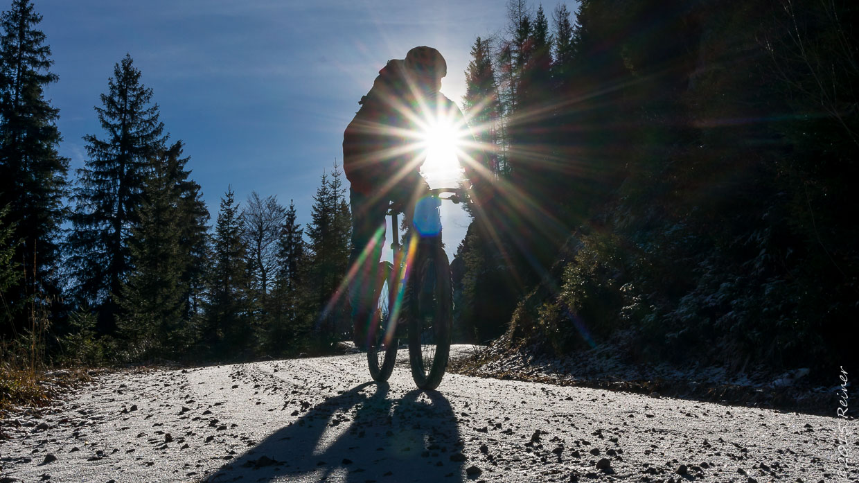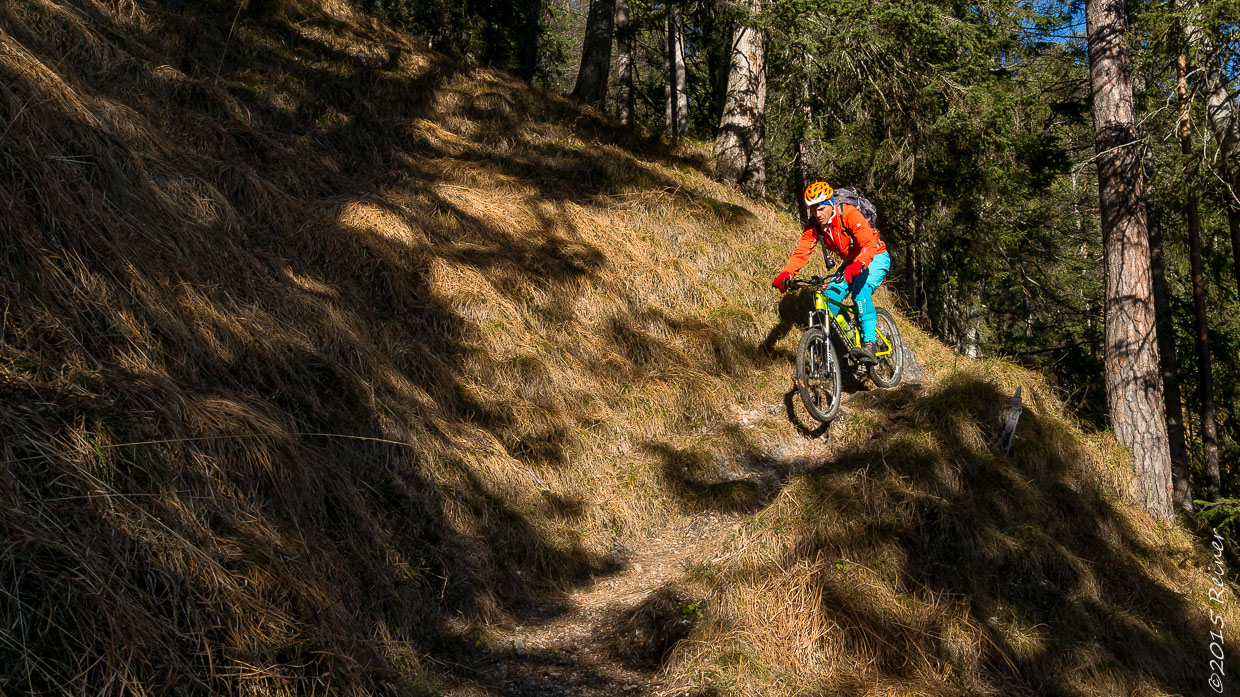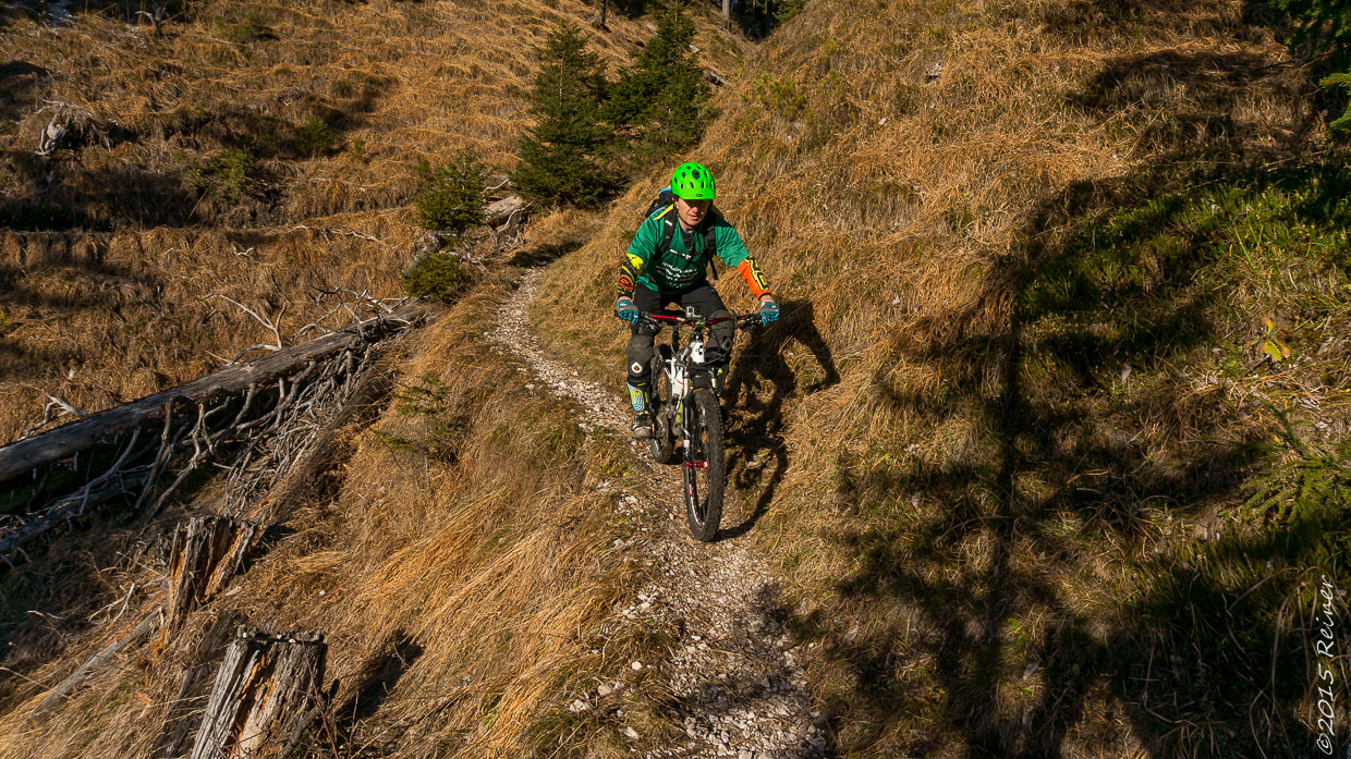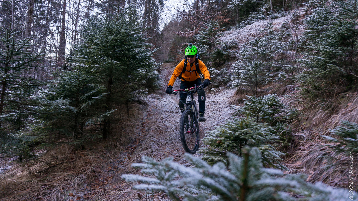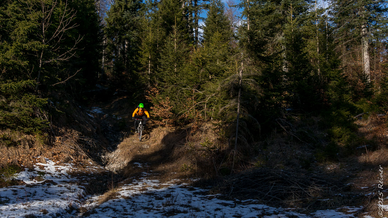 Sobald wir aber etwas den Südhang hochgekurbelt sind waren wir in der Sonne und es war super gemütlich. Nach den ersten 300Hm gings auch gleich über einen alten Reitsteig runter in den Kühlschrank. Sehr schönes Wegerl