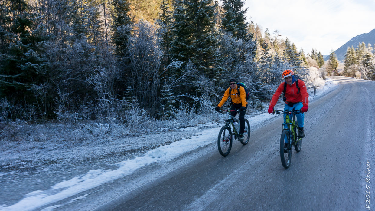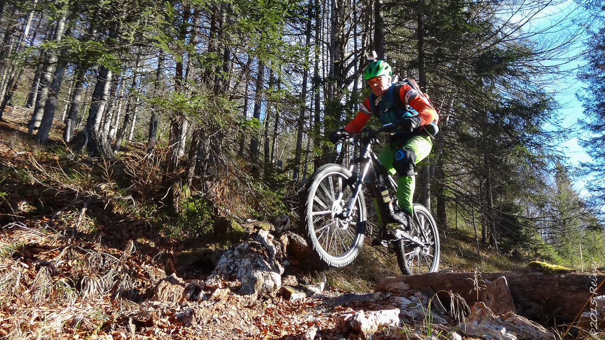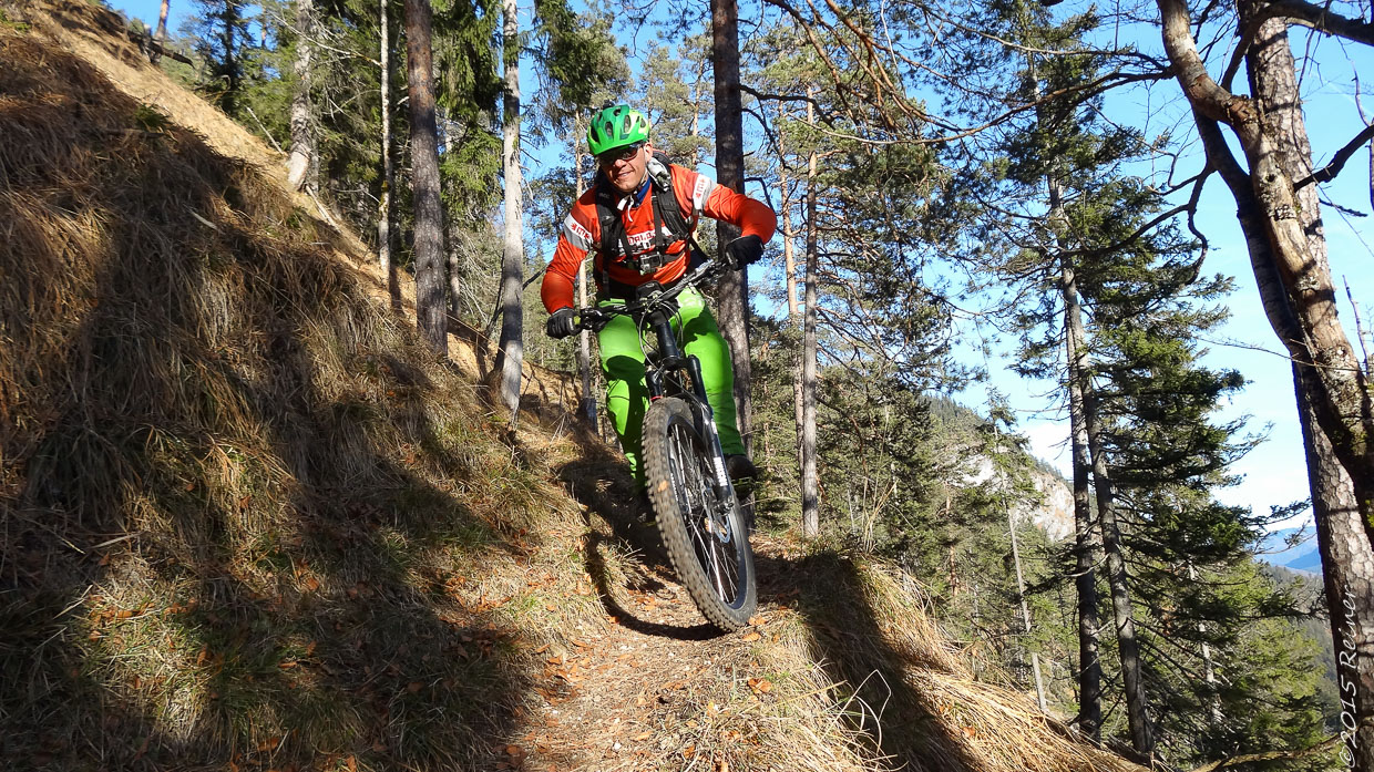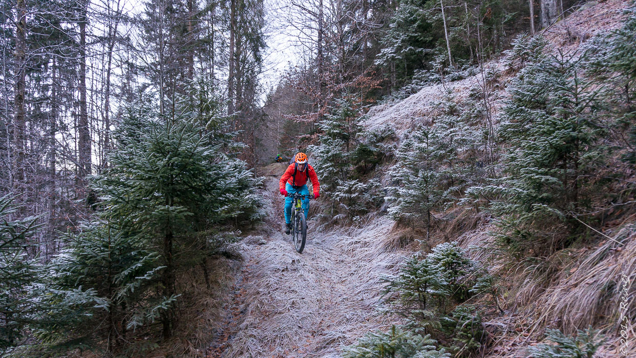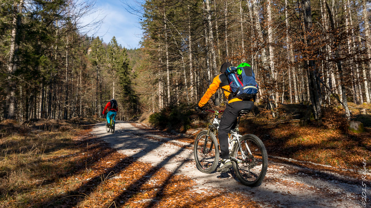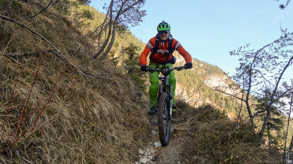 Sobald wir aber etwas den Südhang hochgekurbelt sind waren wir in der Sonne und es war super gemütlich. Nach den ersten 300Hm gings auch gleich über einen alten Reitsteig runter in den Kühlschrank. Sehr schönes Wegerl