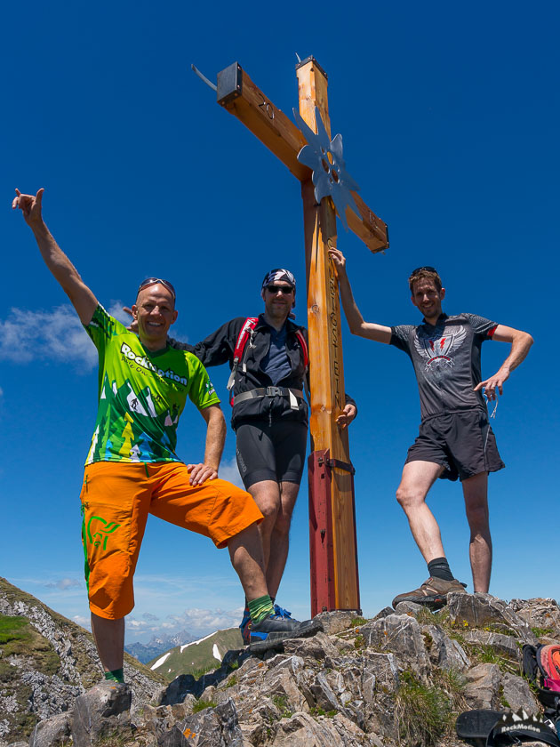 Vom Parkplatz der Grubigsteinbahn ging es über Forstwege an der Grubigalm vorbei zur Grubigsteinhütte. Zum Ende der gut 1000Hm am Stück nagten die groben Schotterrampen doch etwas an der Kraft. Die Aussicht von der Hüttenterasse bietet aber grandiose Entschädigung. Zu dritt sind wir noch zum Gipfel des Grubigstein gekraxelt was von oben noch mehr Aussicht bedeut.