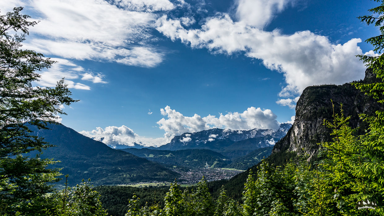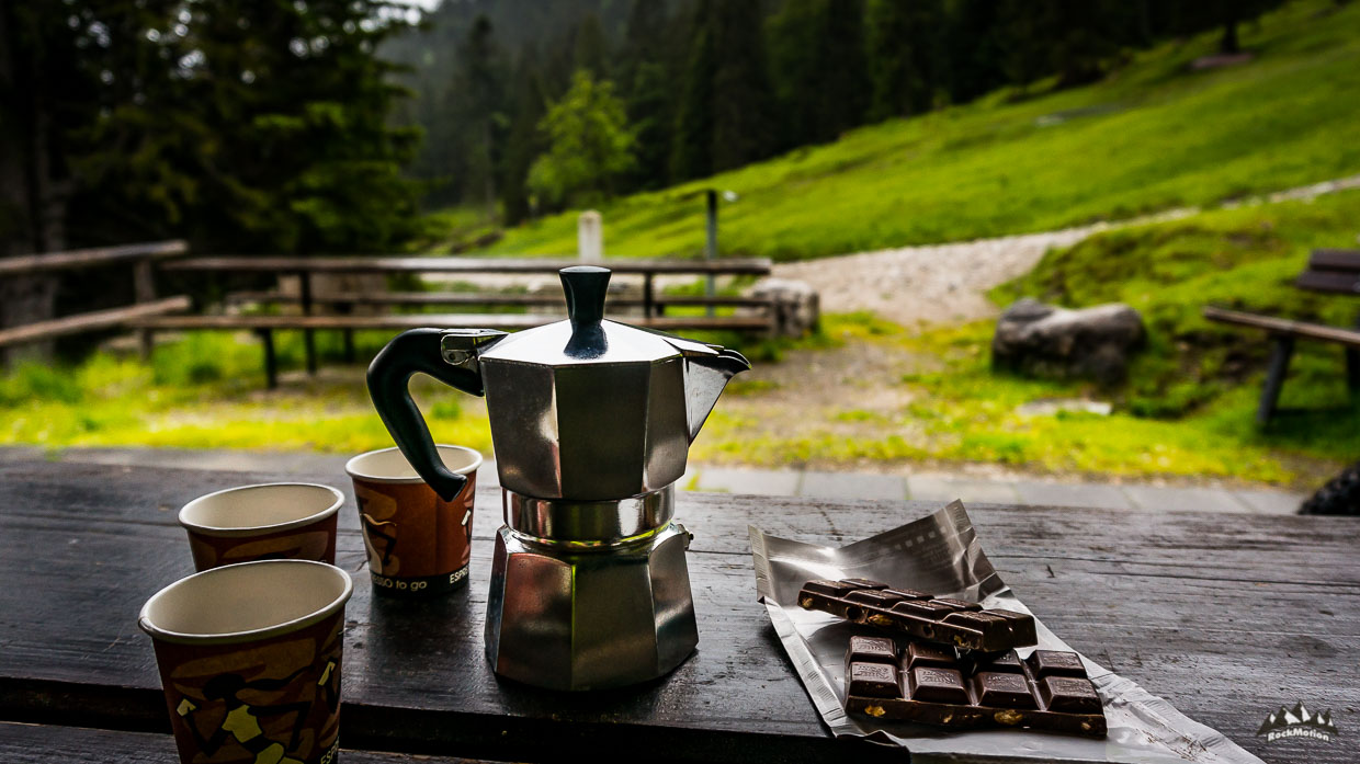 Nachdem die Gipfelpause sehr kurz ausgefallen ist, hat uns die weit überdachte Bank vor der Alm zu einer Rast eingeladen. Gut so, 5 Minuten nachdem wir angekommen sind hats so richtig geduscht. Bei eins, zwei Espresso mit Schokolade konnte man das aber gut aushalten - so ne Stunde lang wars auch nötig. Der leichte Gegenanstieg zum Gießenbachsattel kam dann gerade recht um uns wieder warm zu machen. Den Schafkopf Gipfel haben wir dann ausgelassen und sind den Trail kurz nach dem Sattel hinab. Super fein - Spitzkehren sollte man solide können, inkl. Tiefblick gerade aus inklusive. Etwas leichter als der Gipfeltrail, aber nicht minder schön. Unten raus wirds immer flüssiger und einfacher bevor man durch den Wasserfall unten am Spießlplatz in Farchant ausgespuckt wird und der Zauber schon vorbei ist. Wiederholung folgt bestimmt.