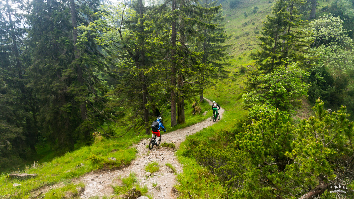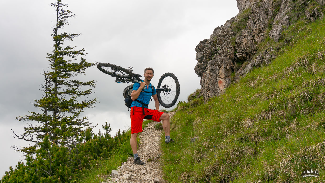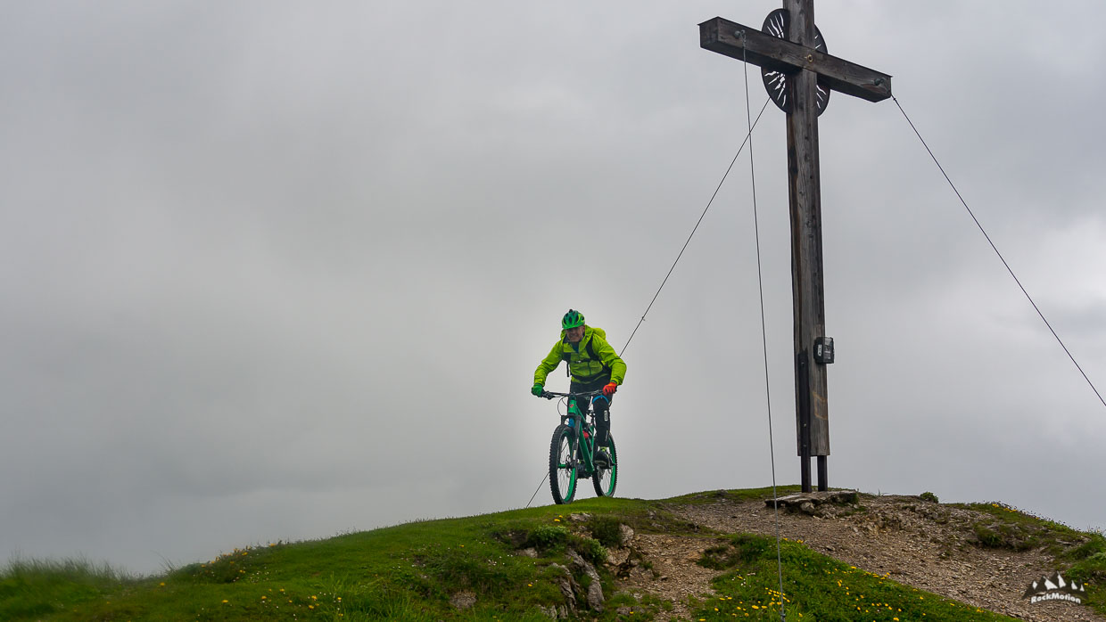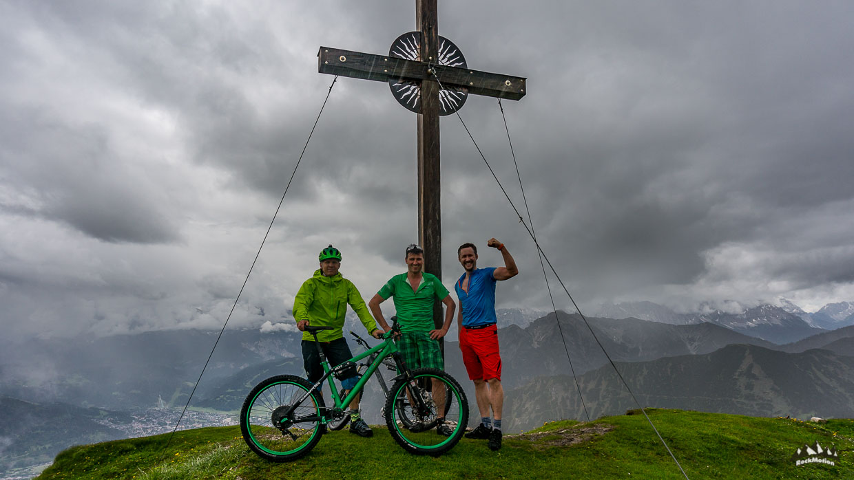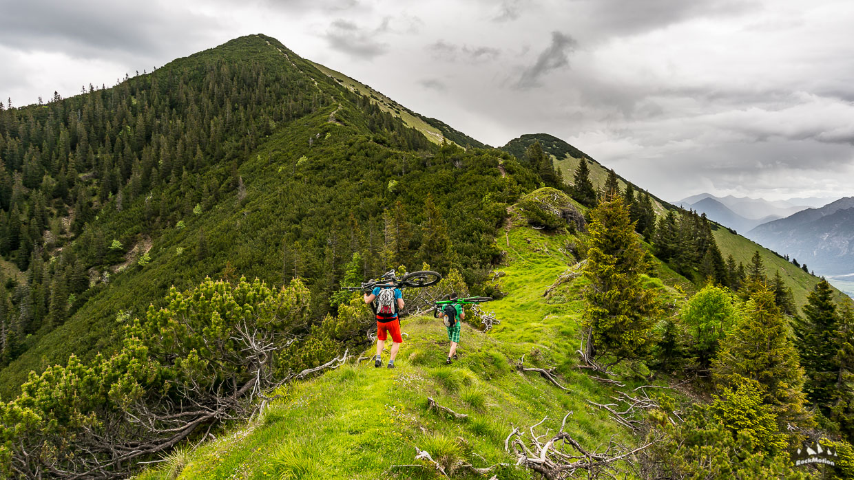 Zeitig am Parkplatz in Burgrain gestartet gings zuerst den schon öfters gefahrern Weg zur Enningalm, später die Rampe zum Gießenbachsattel hinauf. Von hier dann hinten rum zur Roßalm und dann mit dem Rad auf der Schulter weiter zum Hasenjöchl. Bis hier her noch trocken, am Anfang auch richtig sonnig und warm. Am Hasenjöchl hatten wir dann das erste mal Aussicht Richtung Westen und haben schon die ersen Regenfahnen Gegenüber gesehen. Kurz Riegelpause und weiter, lange hat es nicht mehr gedauert bis die ersten Tropfen uns ganz schöne beschleunigt haben. Am Gipfel dann kurz abklatschen - HighFive - Regenjacke und Schoner an - Entspannen und Lachen nicht vergessen - und mit kalten Fingern die Abfahrt meistern. Reifen halten dann doch besser als man denkt und nach 200Hm war der Regen auch wieder vorbei. Spitzkehre um Spitzkehre, Steinstufe und Wurzelfelder mischen sich mit einfacheren Abschnitten hinunter zum Hasenjöchl und weiter zur Roßalm. Genuß pur.
