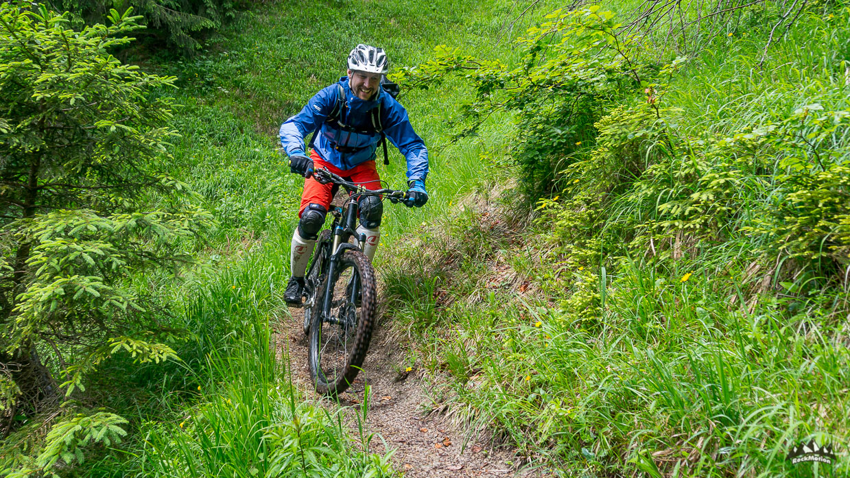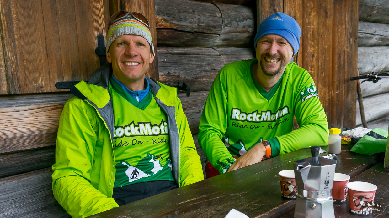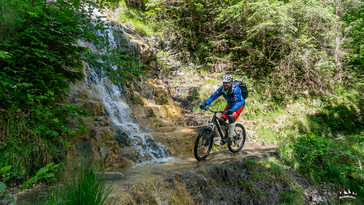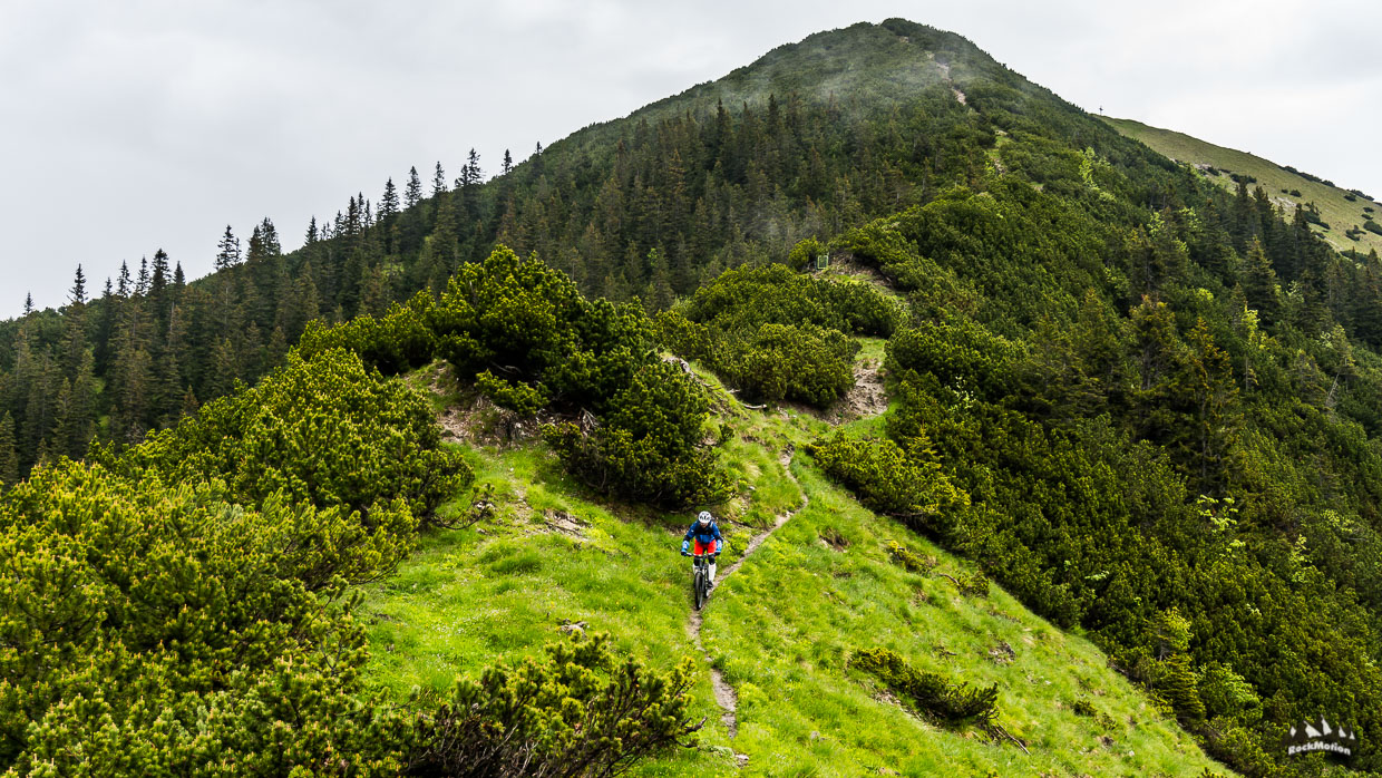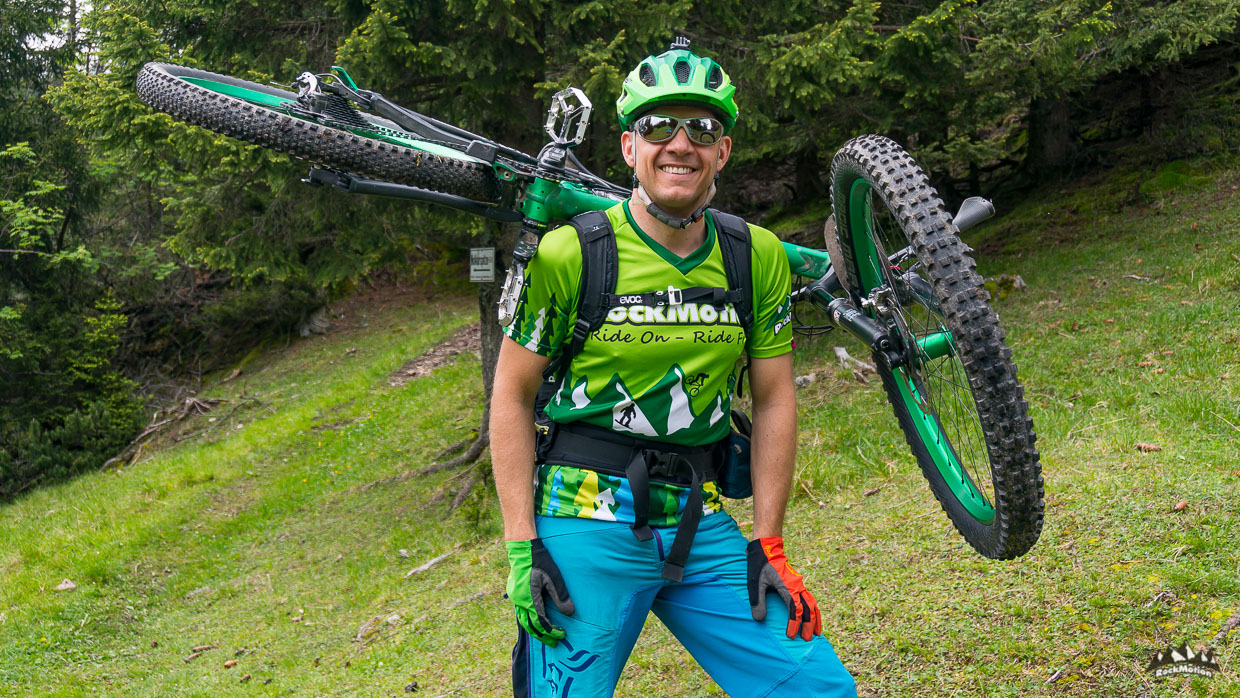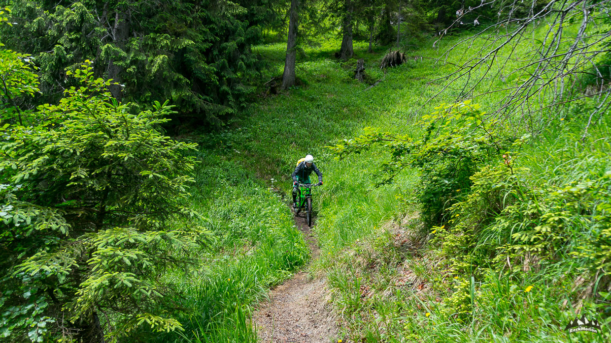 Zeitig am Parkplatz in Burgrain gestartet gings zuerst den schon öfters gefahrern Weg zur Enningalm, später die Rampe zum Gießenbachsattel hinauf. Von hier dann hinten rum zur Roßalm und dann mit dem Rad auf der Schulter weiter zum Hasenjöchl. Bis hier her noch trocken, am Anfang auch richtig sonnig und warm. Am Hasenjöchl hatten wir dann das erste mal Aussicht Richtung Westen und haben schon die ersen Regenfahnen Gegenüber gesehen. Kurz Riegelpause und weiter, lange hat es nicht mehr gedauert bis die ersten Tropfen uns ganz schöne beschleunigt haben. Am Gipfel dann kurz abklatschen - HighFive - Regenjacke und Schoner an - Entspannen und Lachen nicht vergessen - und mit kalten Fingern die Abfahrt meistern. Reifen halten dann doch besser als man denkt und nach 200Hm war der Regen auch wieder vorbei. Spitzkehre um Spitzkehre, Steinstufe und Wurzelfelder mischen sich mit einfacheren Abschnitten hinunter zum Hasenjöchl und weiter zur Roßalm. Genuß pur.