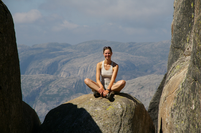 Susi auf dem Kjerag über dem Lysefjord / Norwegen